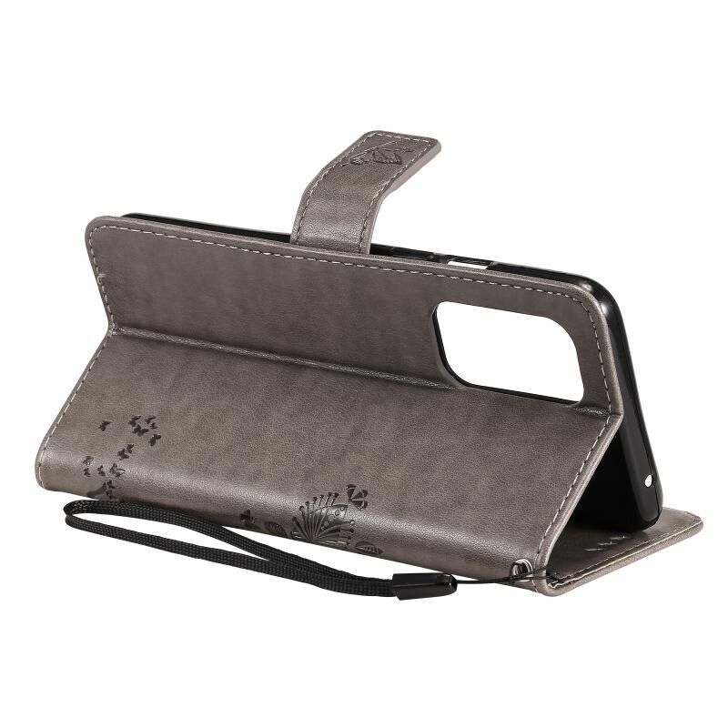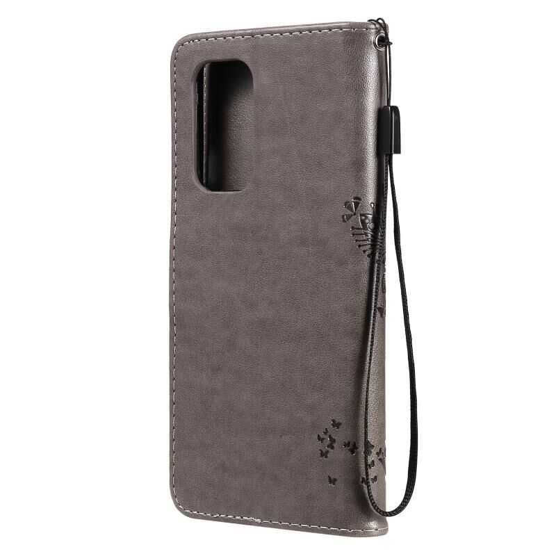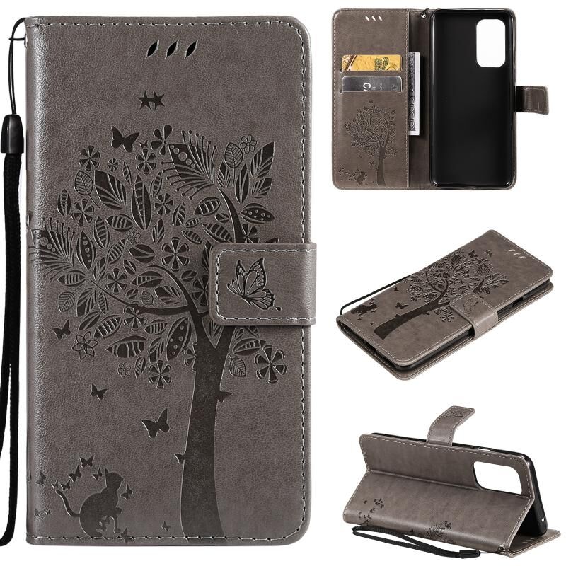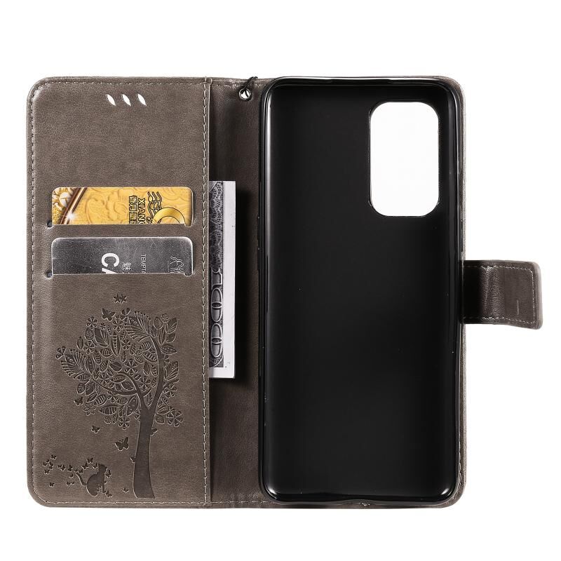 Για OnePlus 9 δέντρο & Cat μοτίβο πιεσμένη εκτύπωση οριζόντια Flip PU δέρμα υπόθεση με κάτοχο & υποδοχές για κάρτες & πορτοφόλι & κορδόνι (γκρι)