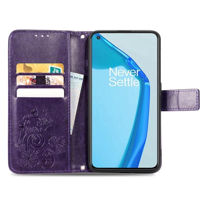 Για OnePlus 9R Τέσσερα φύλλα κούμπωμα ανάγλυφο αγκράφα κινητό τηλέφωνο προστασία δερμάτινη θήκη με κορδόνι & υποδοχή για κάρτες & πορτοφόλι & βραχίονα λειτουργία (μοβ)