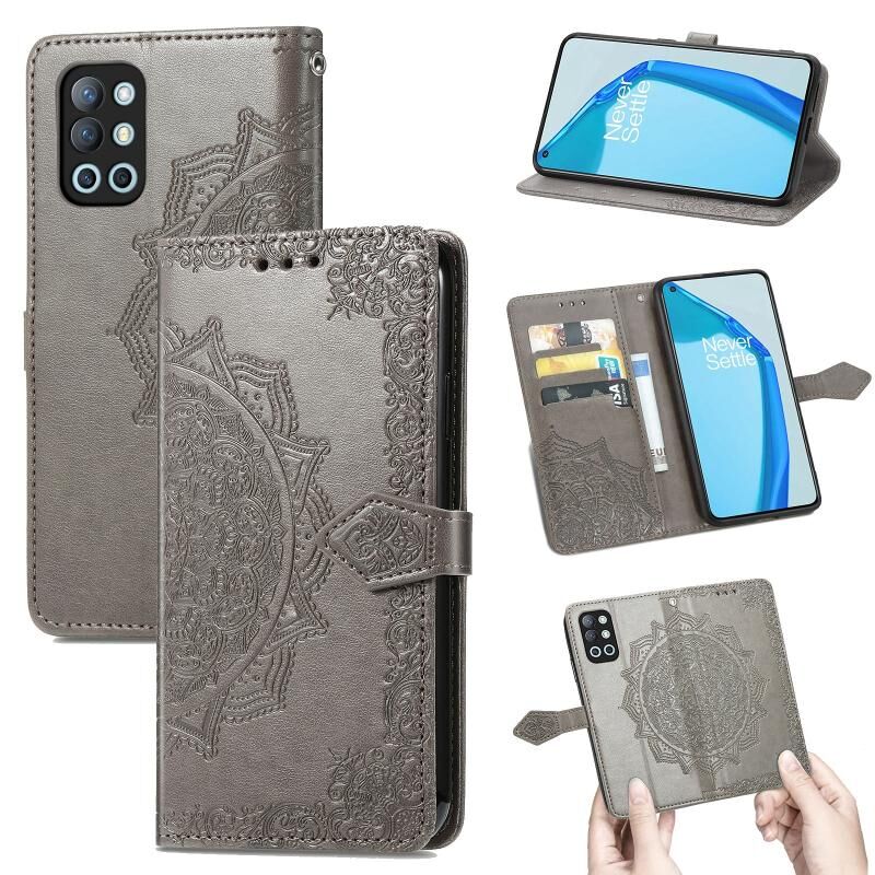 Για OnePlus 9R Mandala λουλούδι ανάγλυφο οριζόντια Flip δερμάτινη θήκη με κάτοχο & τρεις υποδοχές για κάρτες & πορτοφόλι & κορδόνι (γκρι)