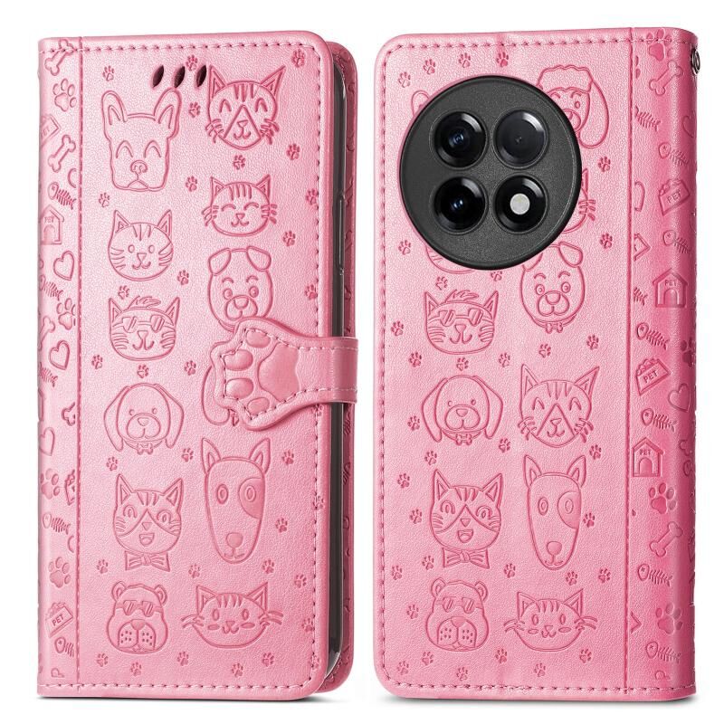 For OnePlus Ace 2 Cat and Dog Embossed Phone Leather Phone Case(Pink)