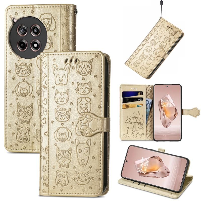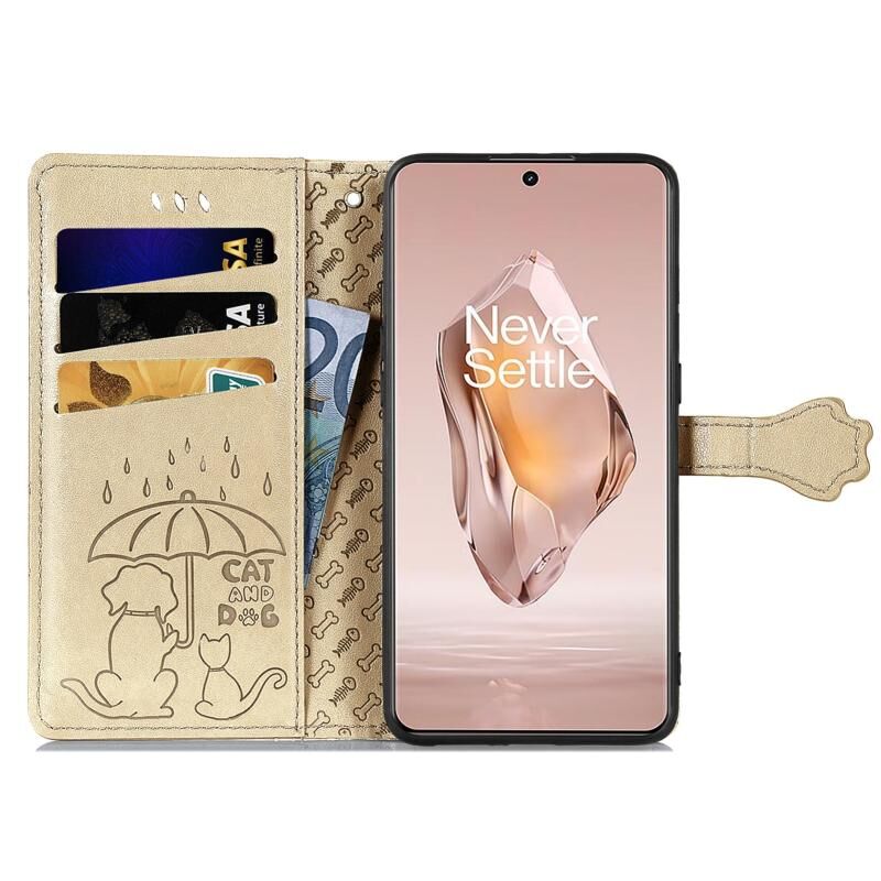 Θήκη τηλεφώνου από δέρμα με ανάγλυφο σχέδιο γάτας και σκύλου για OnePlus Ace 3 (Χρυσορόδινο)