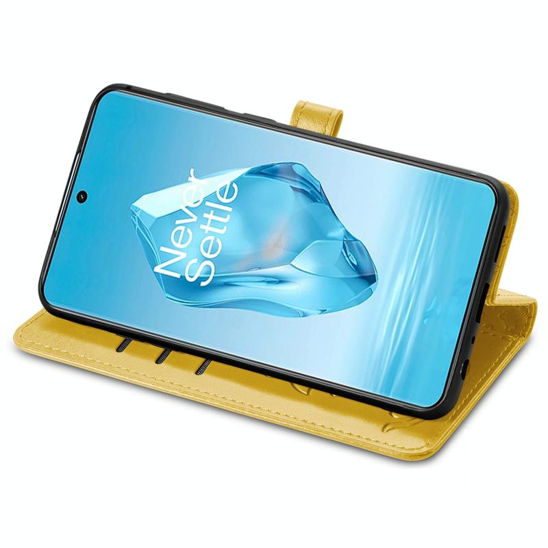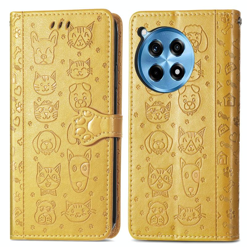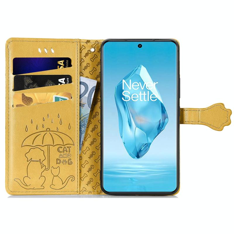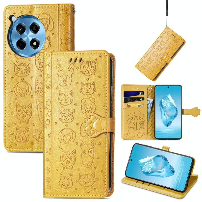 Θήκη Δερμάτινη με Χαρακτά Cat & Dog για OnePlus Ace 3 Pro (Κίτρινο)