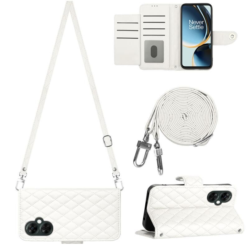 Για OnePlus CE 3 Lite 5G / Nord N30 Rhombic υφή Flip υπόθεση τηλεφώνου δέρμα με μακρύ κορδόνι (λευκό)