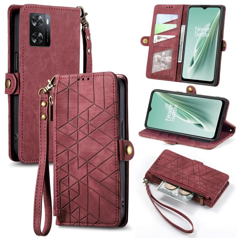 Για OnePlus N20 5G γεωμετρική φερμουάρ πορτοφόλι πλευρά πόρπη δερμάτινη θήκη τηλεφώνου (κόκκινο)