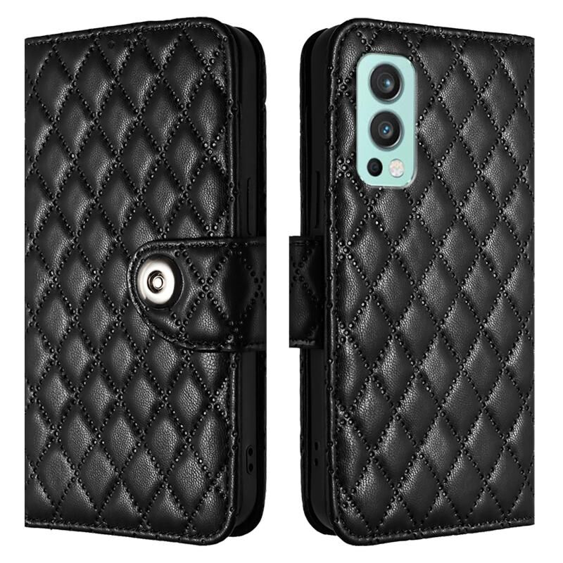 Για το OnePlus Nord 2 5G Rhombic υφή Flip δέρμα τηλέφωνο υπόθεση με κορδόνι (μαύρο)
