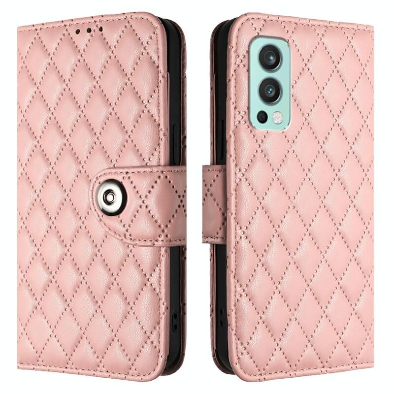 Για OnePlus Nord 2 5G Rhombic υφή Flip υπόθεση τηλεφώνου δέρμα με κορδόνι (Coral Pink)