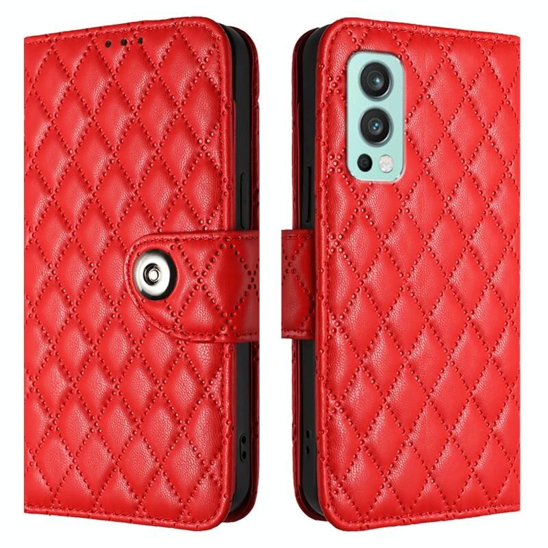 Για το OnePlus Nord 2 5G Rhombic υφή Flip δερμάτινη θήκη τηλεφώνου με κορδόνι (κόκκινο)