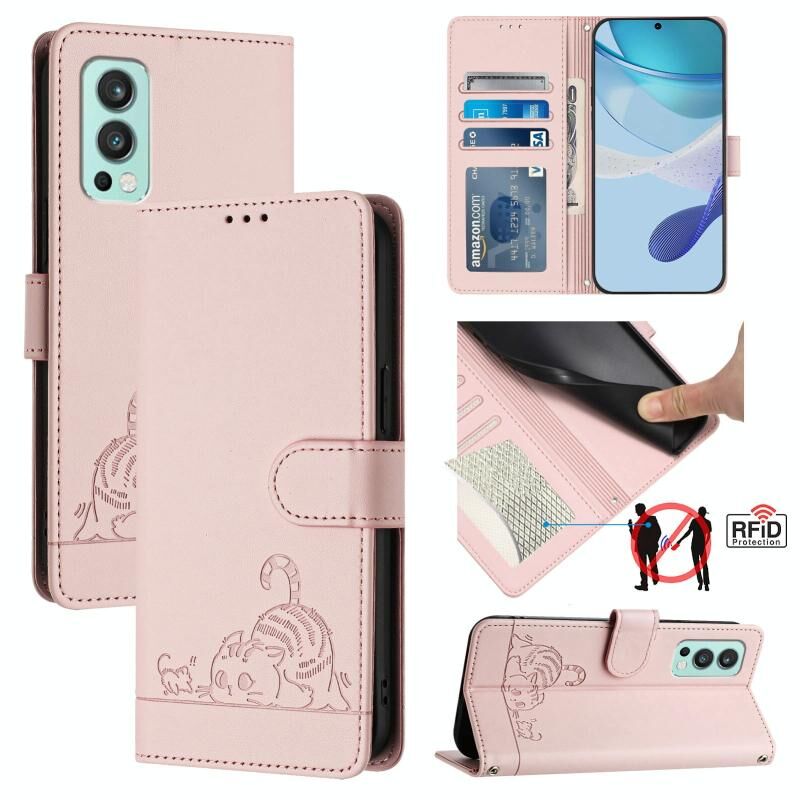 Θήκη τηλεφώνου από δέρμα με ανάγλυφο σχέδιο γάτας και ποντικιού για OnePlus Nord 2 με RFID και κορδόνι (Μέντας Πράσινο)