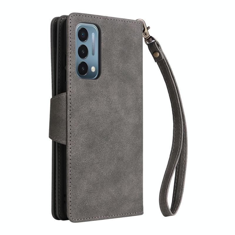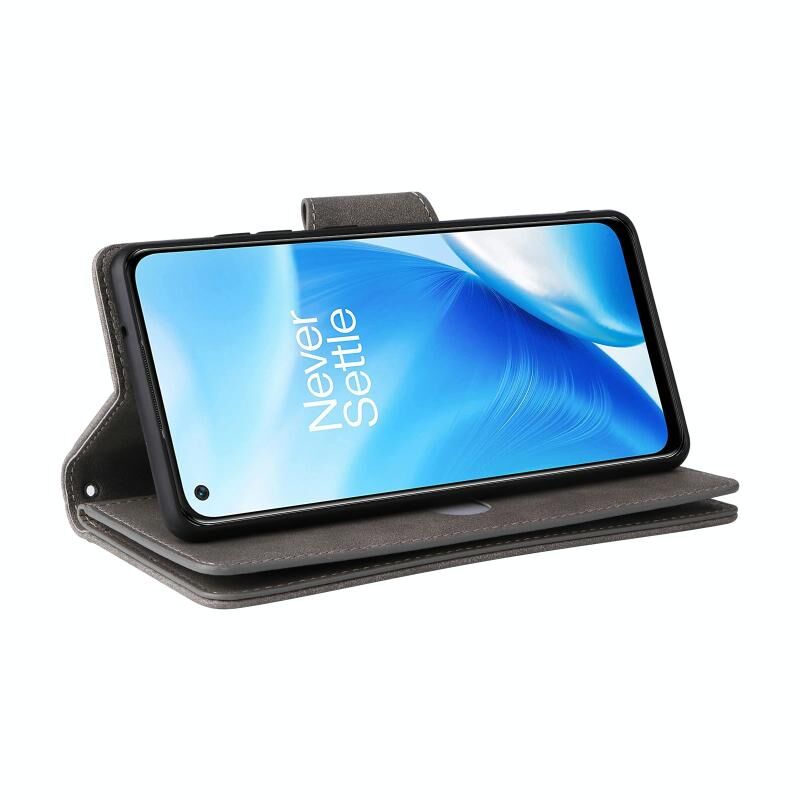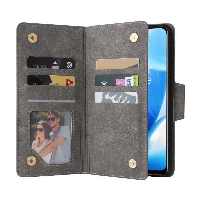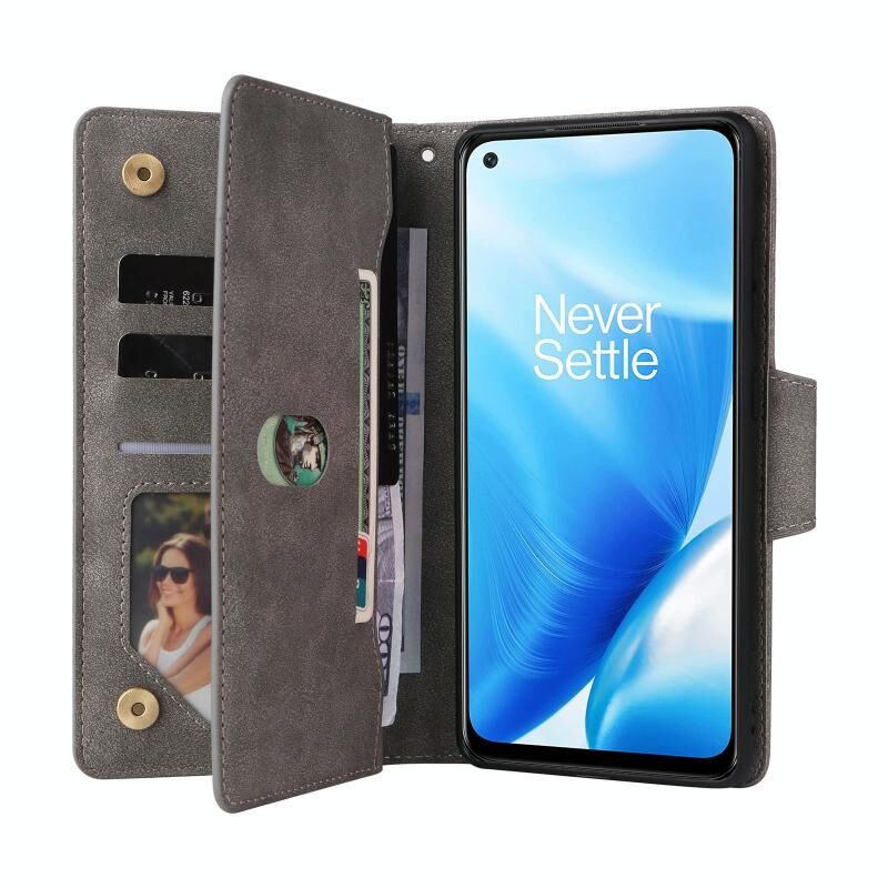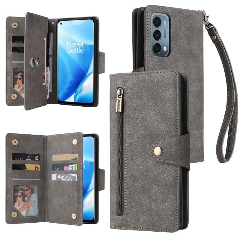 Για OnePlus Nord 200 5G Rivet πόρπη 9 κάρτες τρεις φορές δερμάτινη θήκη τηλεφώνου (γκρι)