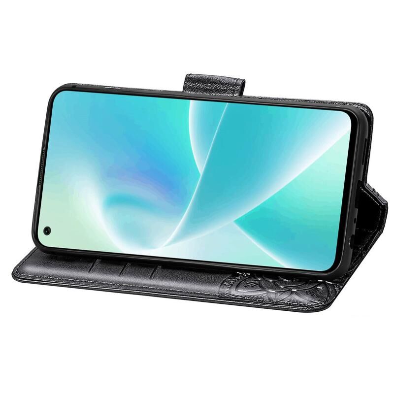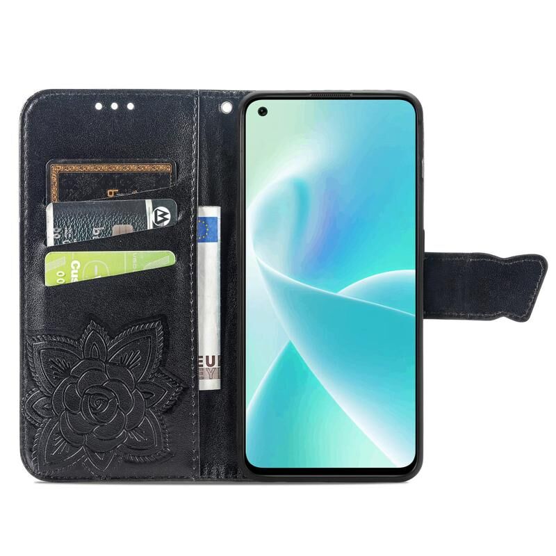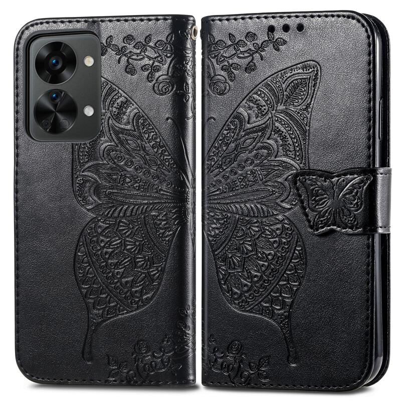 Θήκη τηλεφώνου OnePlus Nord 2T, δερμάτινη, οριζόντια, με ανάγλυφο σχέδιο πεταλούδας και λουλουδιών (Μαύρο)