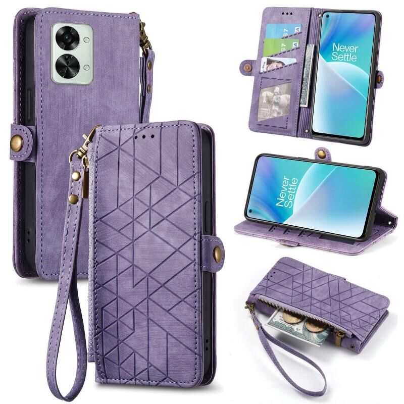 Για OnePlus Nord 2T γεωμετρική φερμουάρ πορτοφόλι πλευρά πόρπη δερμάτινη θήκη τηλεφώνου (μοβ)