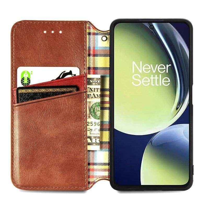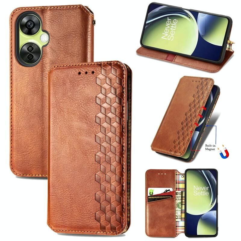 Για OnePlus Nord CE 3 Lite κυβικό πλέγμα πιέζεται μαγνητική δερμάτινη θήκη τηλεφώνου (καφέ)