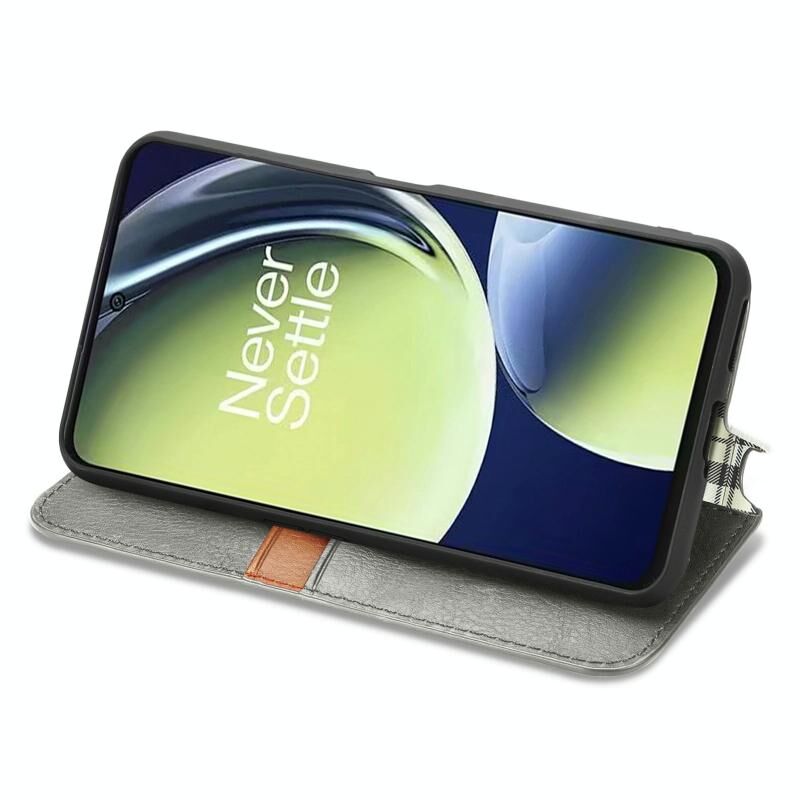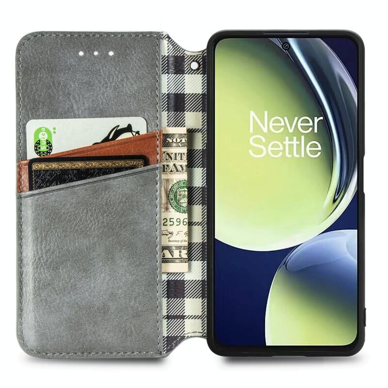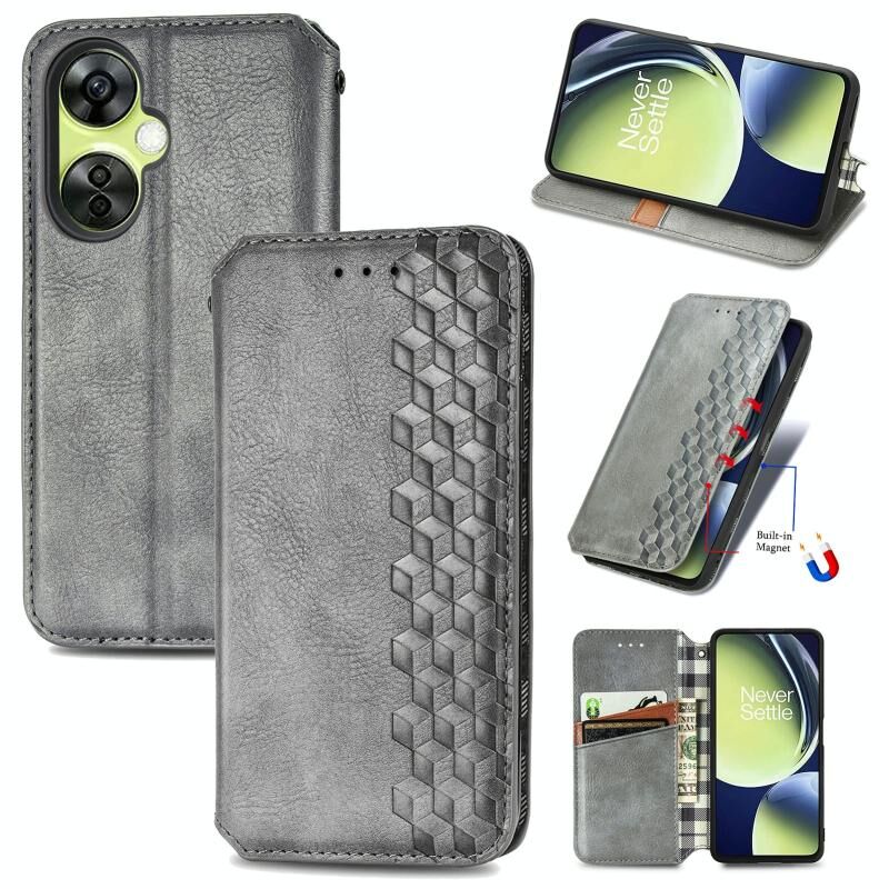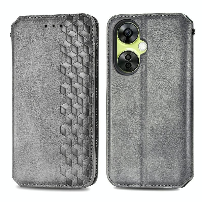 Για OnePlus Nord CE 3 Lite κυβικό πλέγμα πιέζεται μαγνητική δερμάτινη θήκη τηλεφώνου (γκρι)