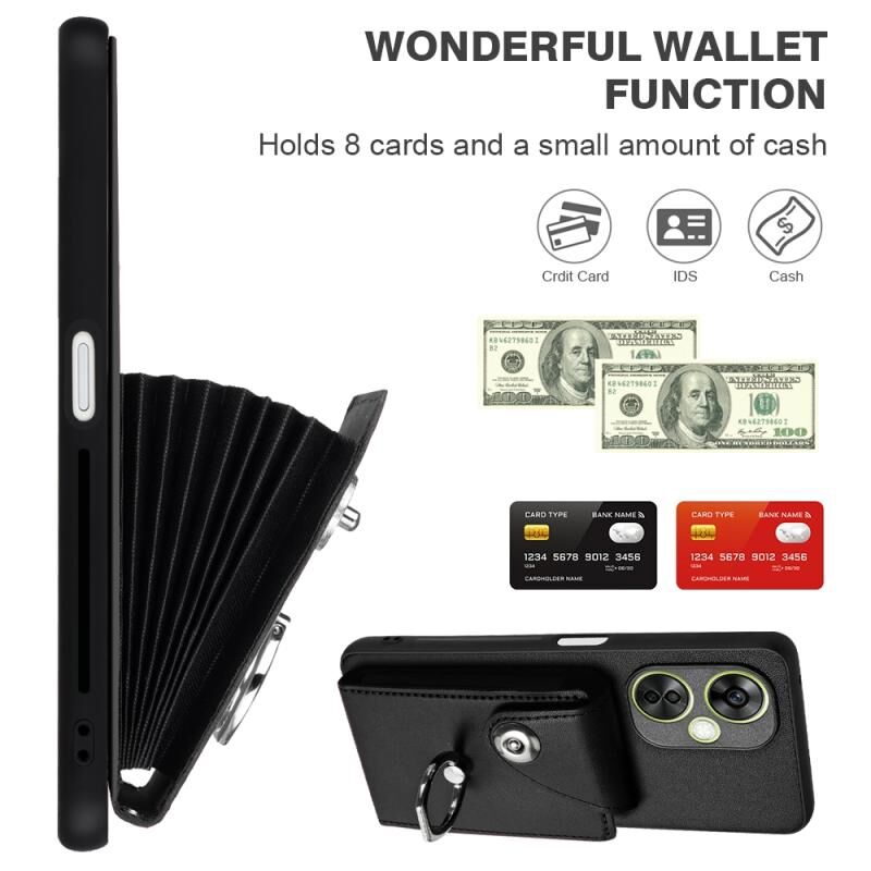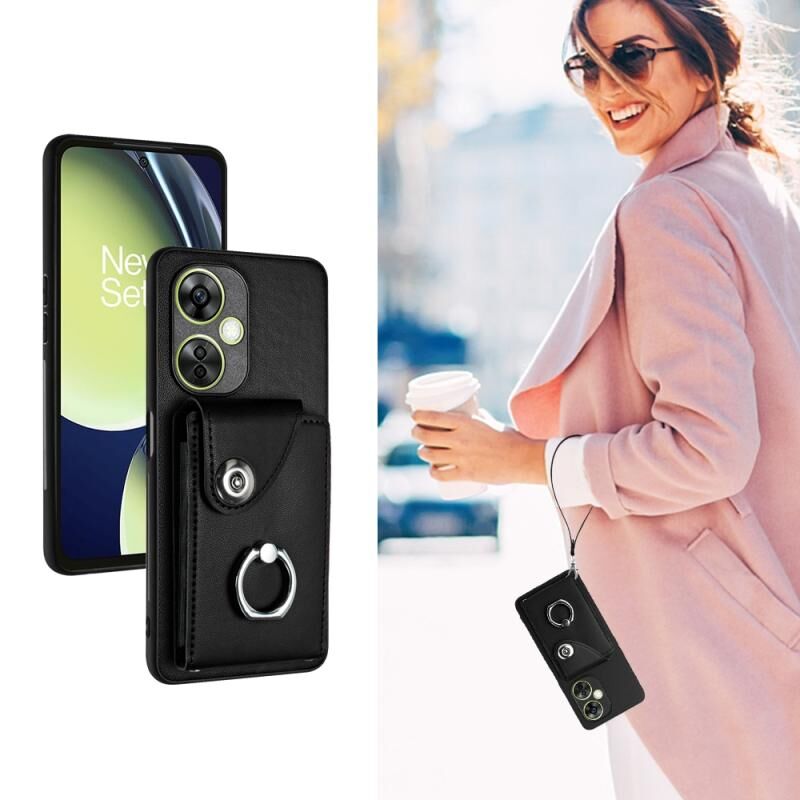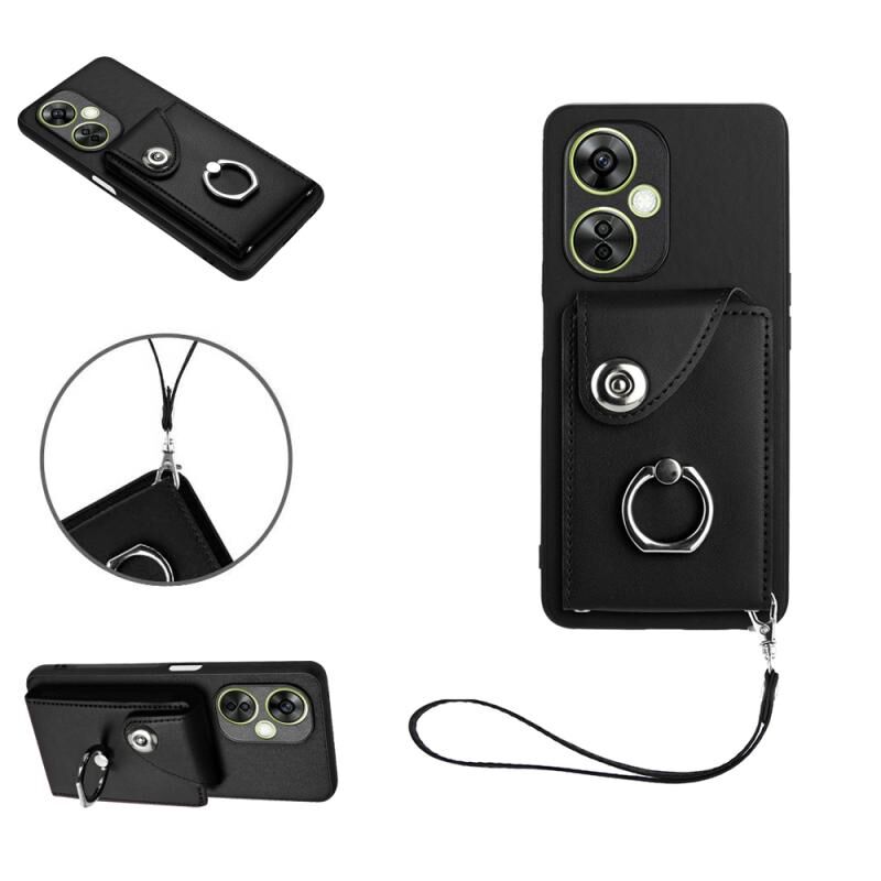 Για OnePlus Nord CE 3 Lite Οργάνου κάρτα τσάντα δαχτυλίδι κάτοχος PU υπόθεση τηλεφώνου με κορδόνι (μαύρο)