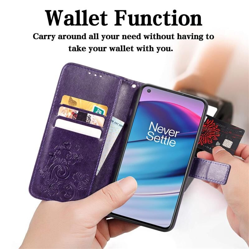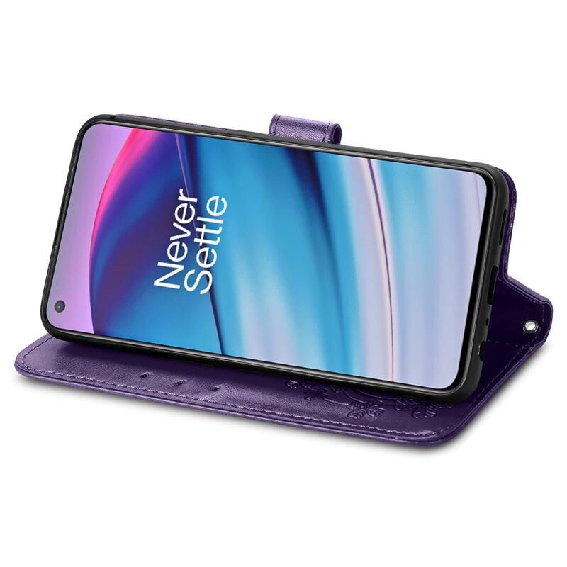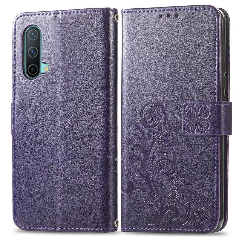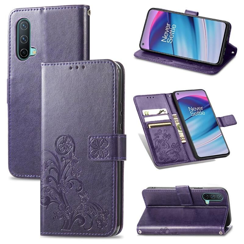 Για OnePlus Nord CE 5G Τέσσερα φύλλα κούμπωμα ανάγλυφο αγκράφα κινητό τηλέφωνο προστασία δερμάτινη θήκη με κορδόνι & υποδοχή κάρτας & πορτοφόλι & λειτουργία βραχίονα (μωβ)