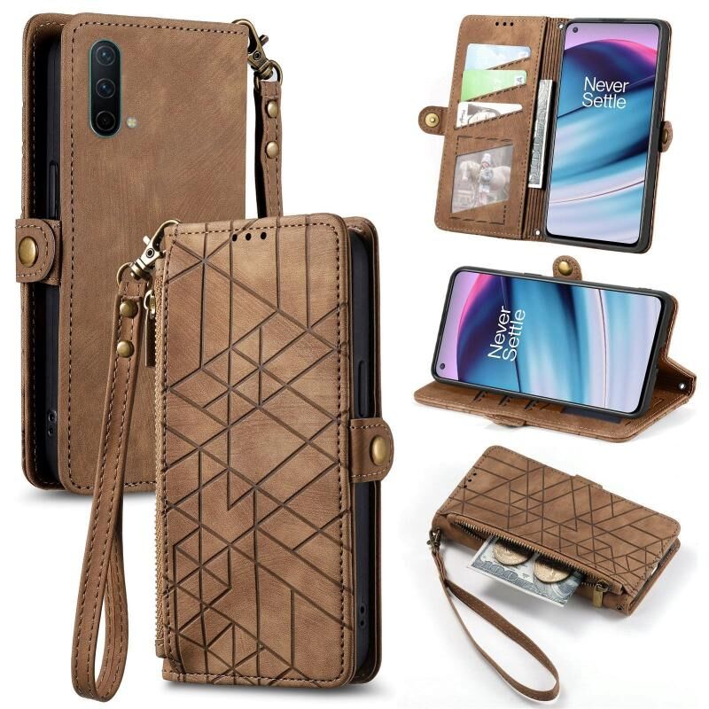 Για OnePlus Nord CE 5G γεωμετρική φερμουάρ πορτοφόλι πλευρά πόρπη δερμάτινη θήκη τηλεφώνου (καφέ)