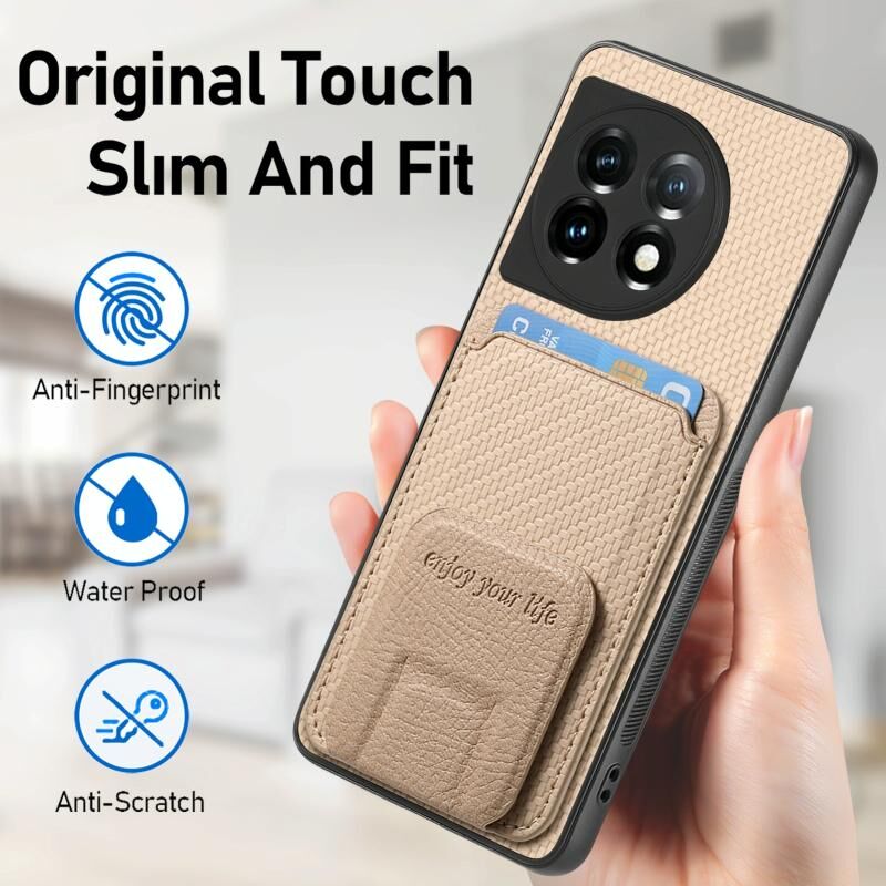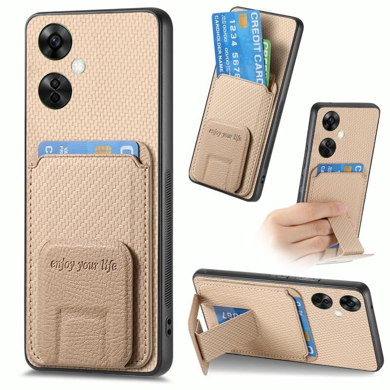 For OnePlus Nord CE3 Lite Carbon Fiber Card Bag Fold Stand Phone Case(Khaki)