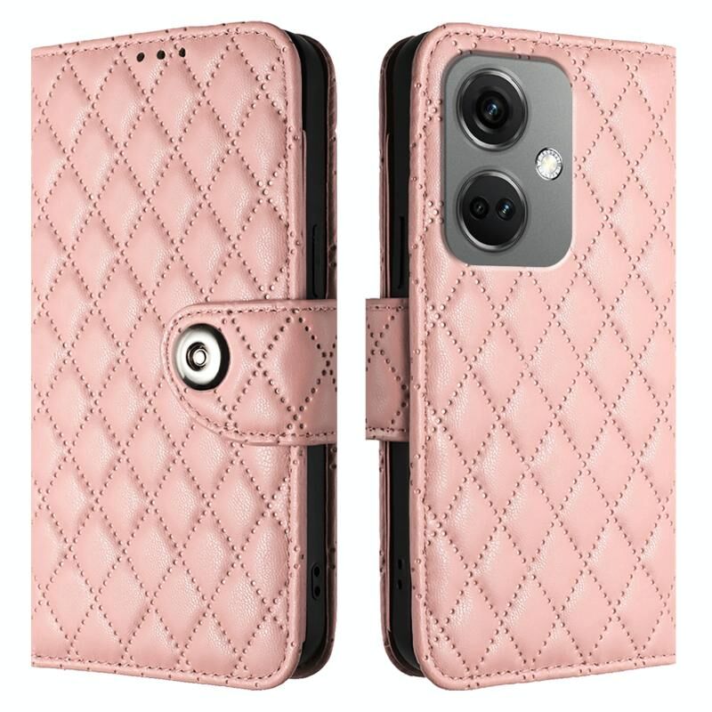 Για OnePlus Nord CE3 Rhombic υφή Flip υπόθεση τηλεφώνου δέρμα με κορδόνι (Coral Pink)
