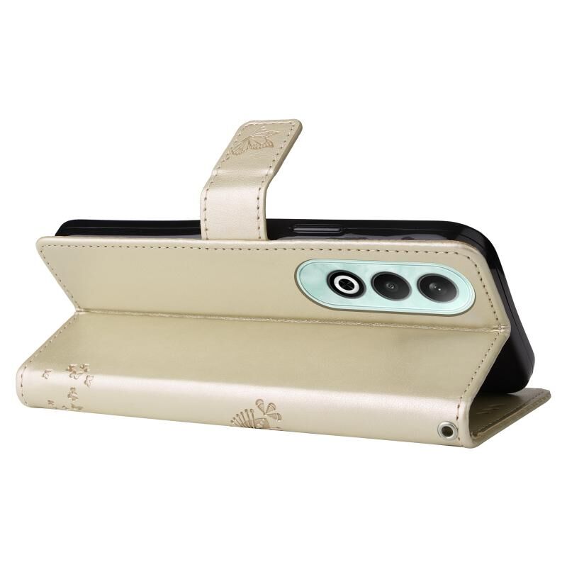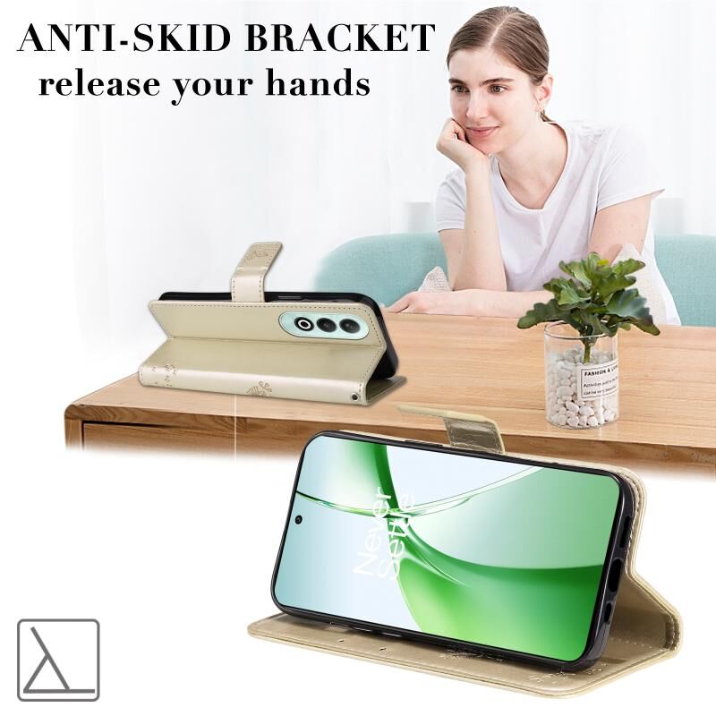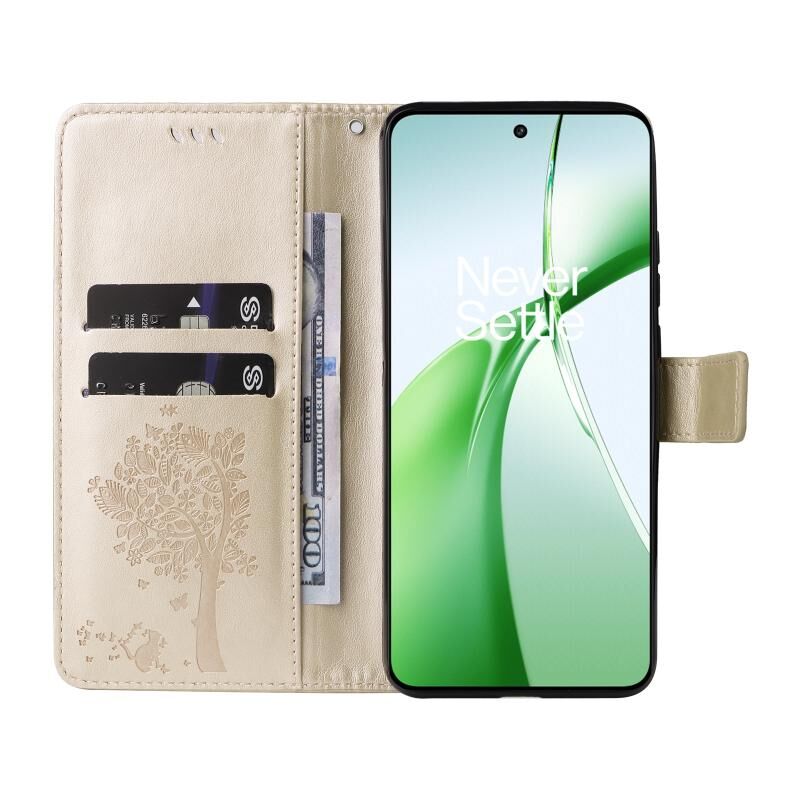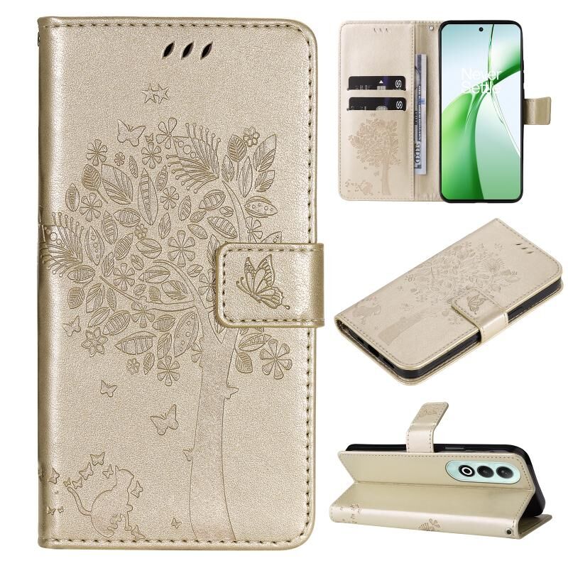 Για OnePlus Nord CE4 Δέντρο & Cat ανάγλυφο μοτίβο Flip υπόθεση τηλεφώνου δέρμα (χρυσό)