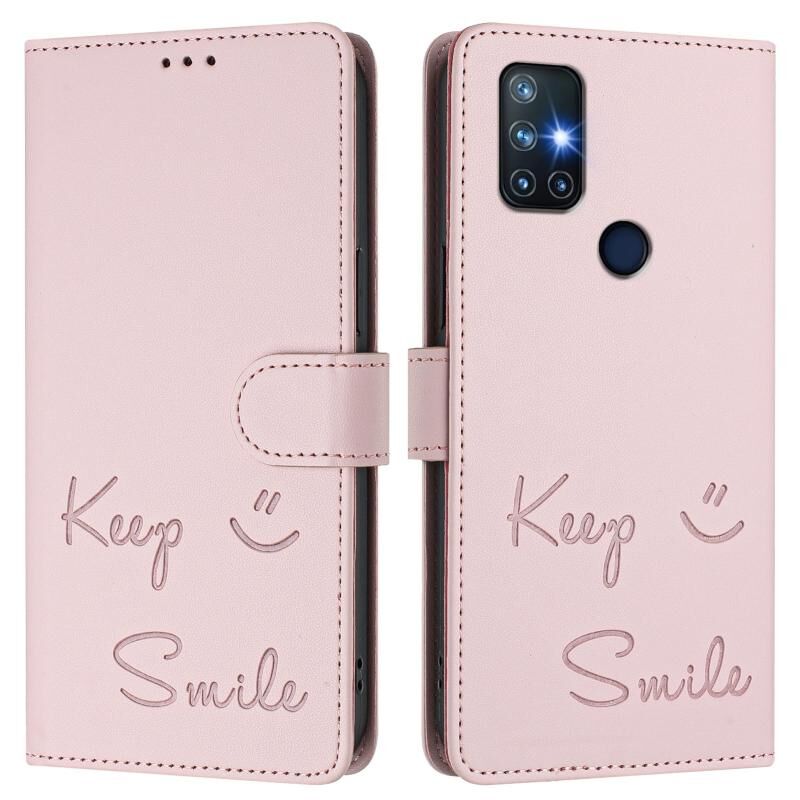 Για OnePlus Nord N10 5G Χαμόγελο ανάγλυφο RFID δερμάτινη θήκη τηλεφώνου (ροζ)