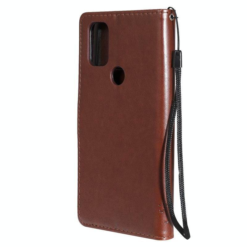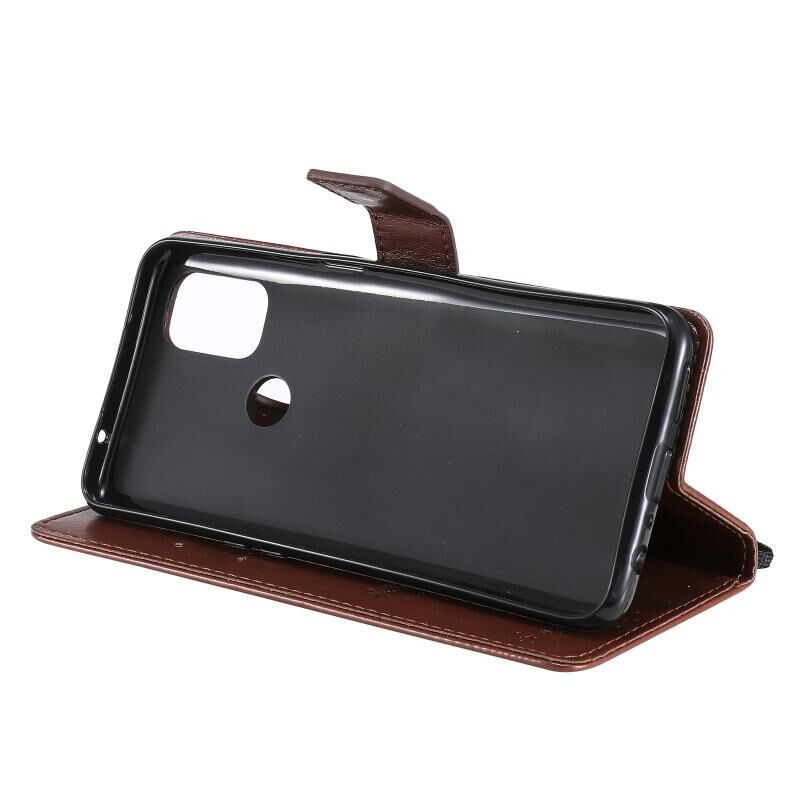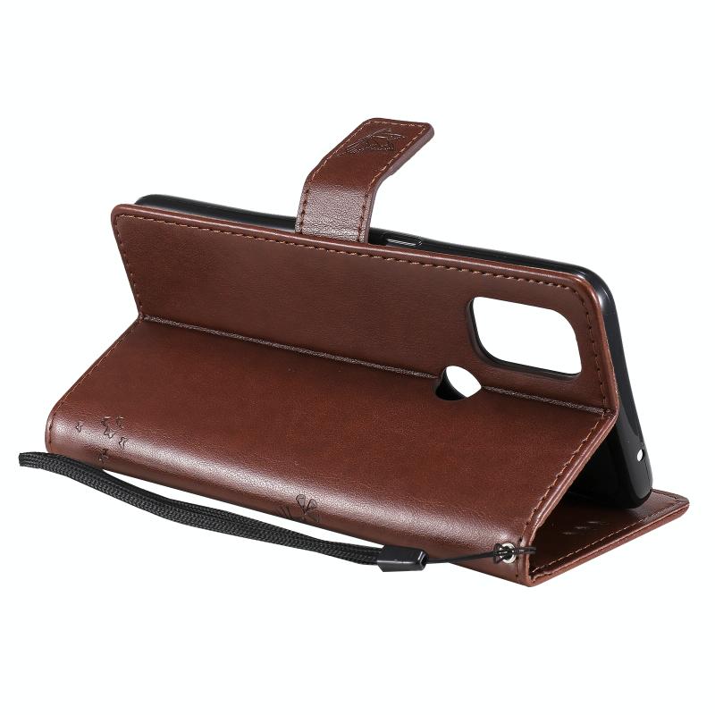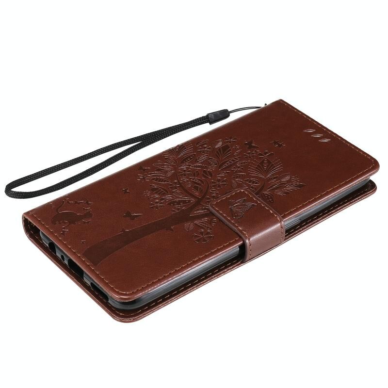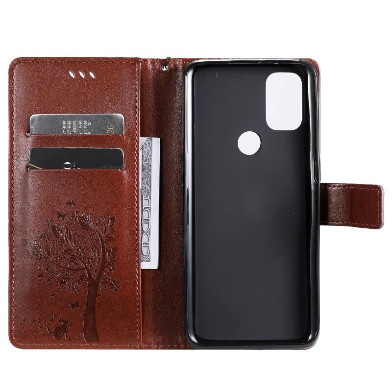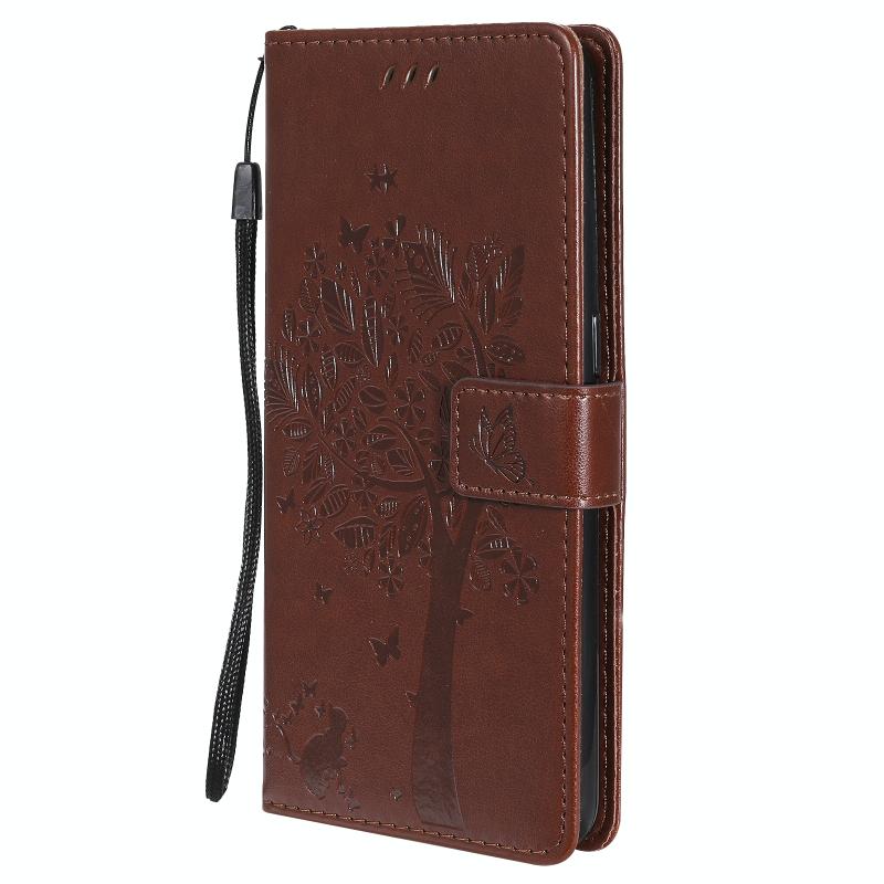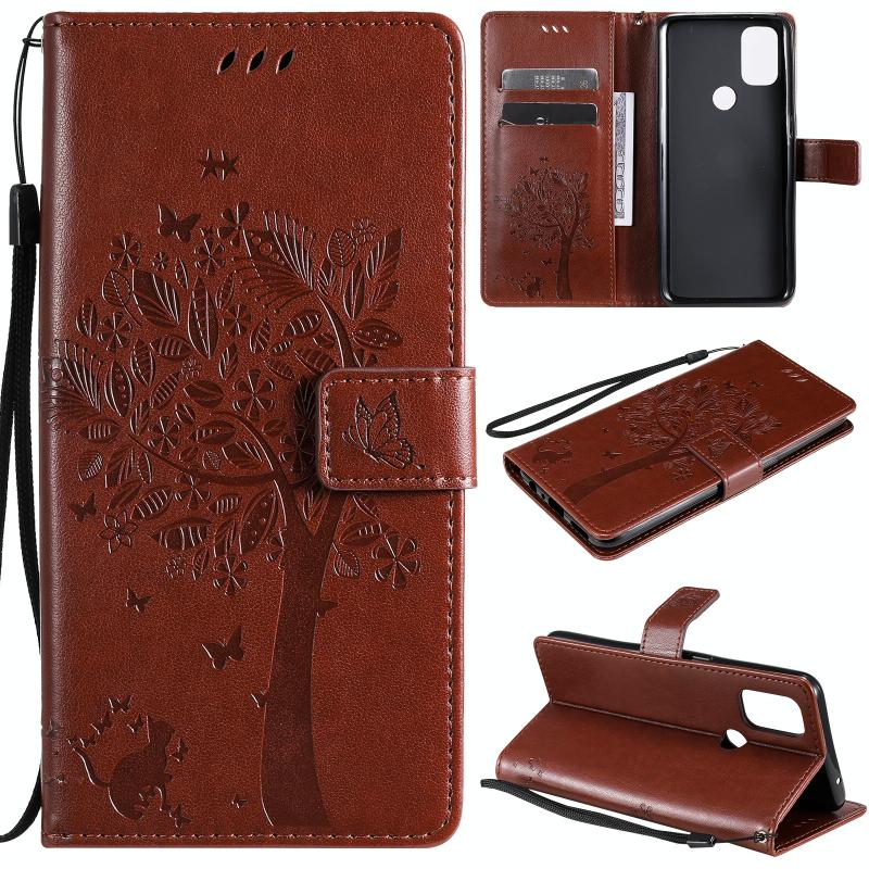 For OnePlus Nord N10 5G Tree & Cat Pattern Pressed Printing Horizontal Flip PU Leather Case with Holder & Card Slots & Wallet & Lanyard(Coffee)
