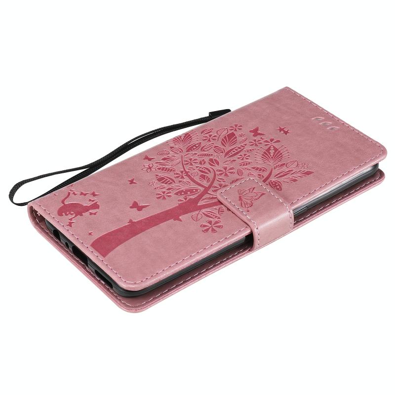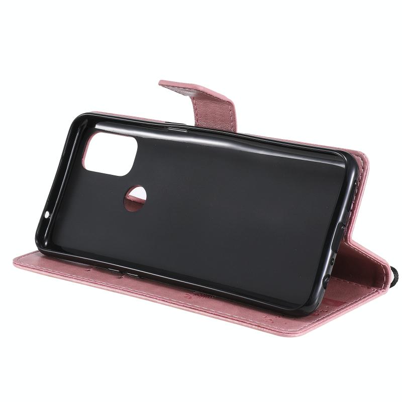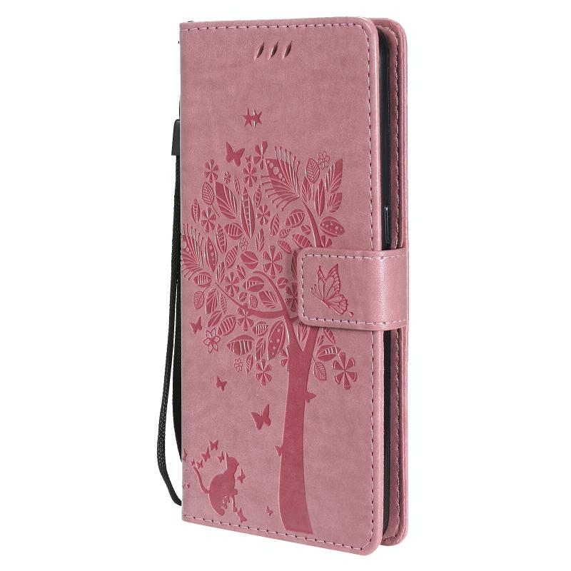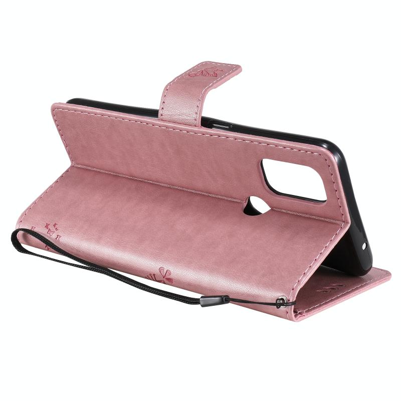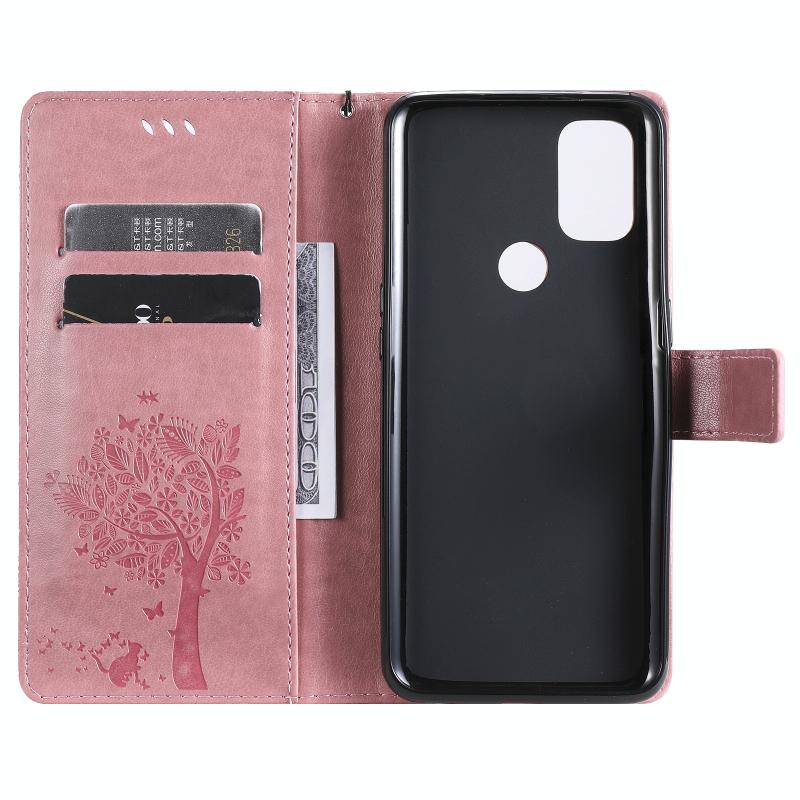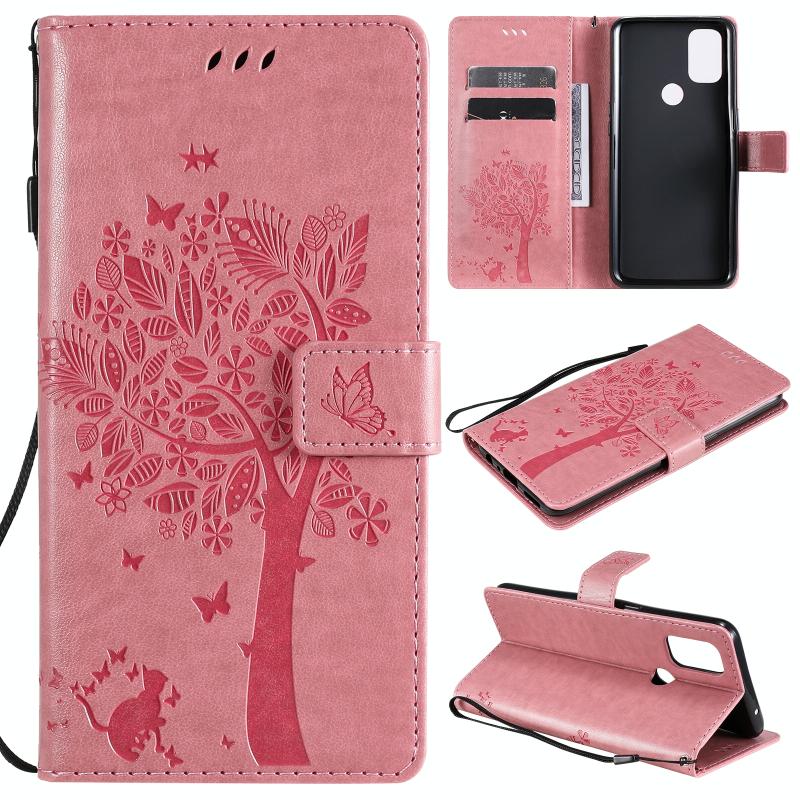 For OnePlus Nord N10 5G Tree & Cat Pattern Pressed Printing Horizontal Flip PU Leather Case with Holder & Card Slots & Wallet & Lanyard(Pink)