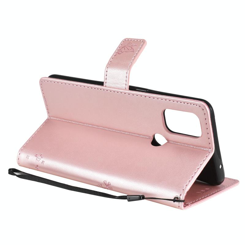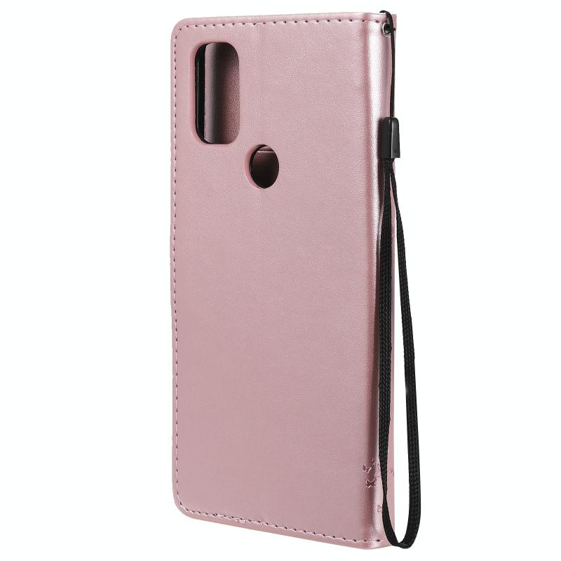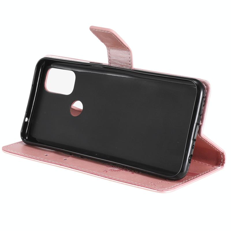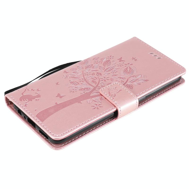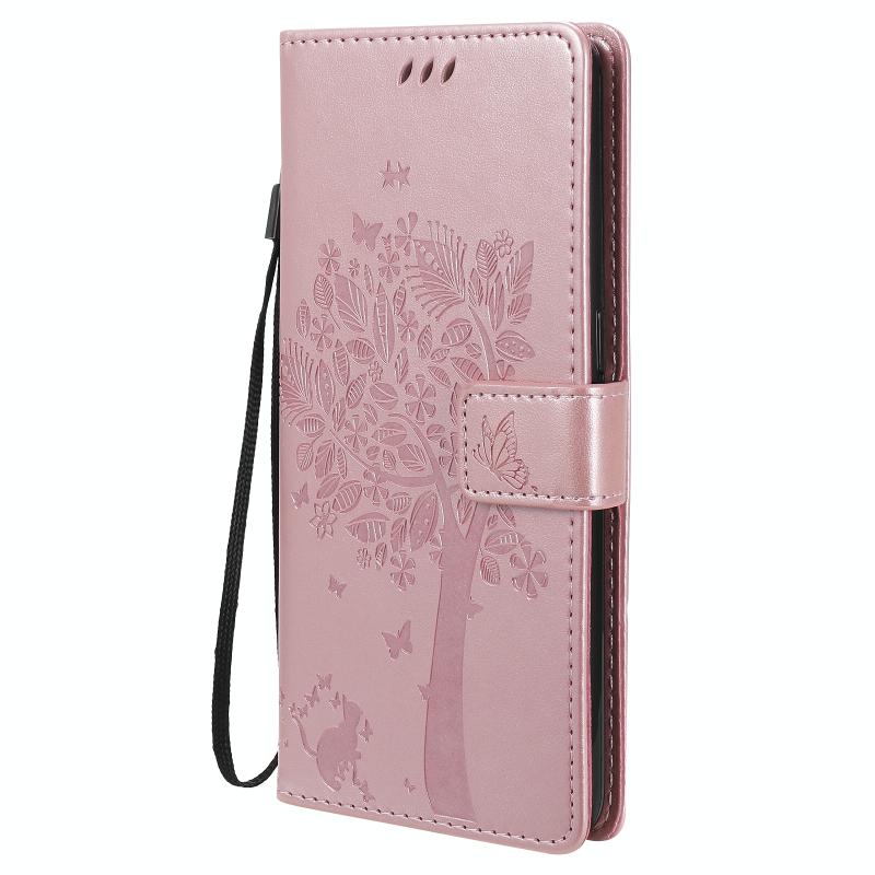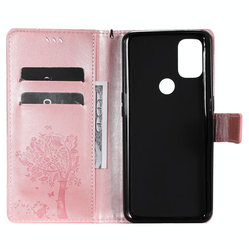 For OnePlus Nord N10 5G Tree & Cat Pattern Pressed Printing Horizontal Flip PU Leather Case with Holder & Card Slots & Wallet & Lanyard(Rose Gold)