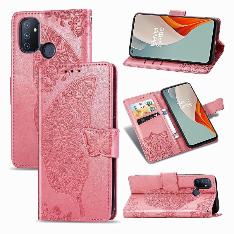 Για OnePlus Nord N100 πεταλούδα αγάπη λουλούδι ανάγλυφο οριζόντια Flip δερμάτινη θήκη με βραχίονα / υποδοχή κάρτας / πορτοφόλι / κορδόνι (ροζ)