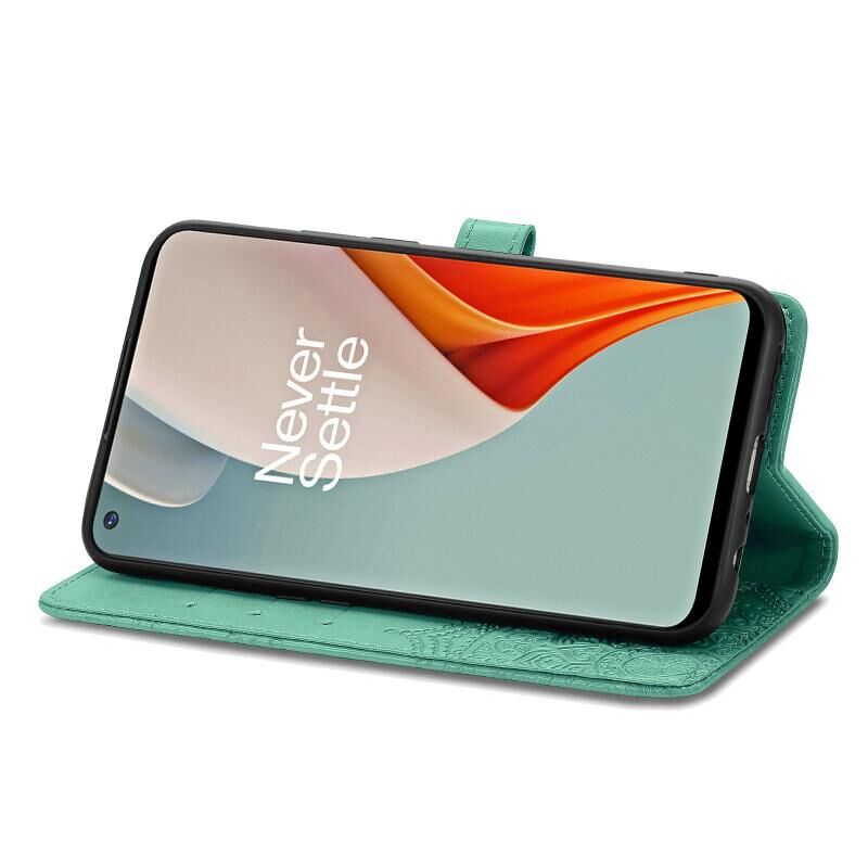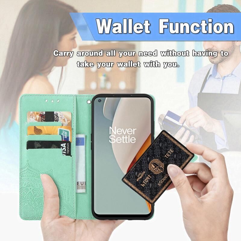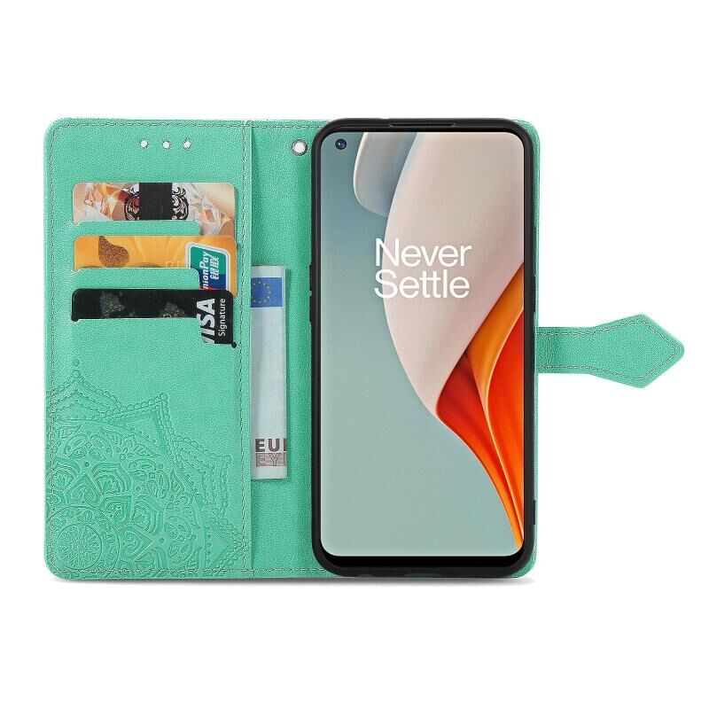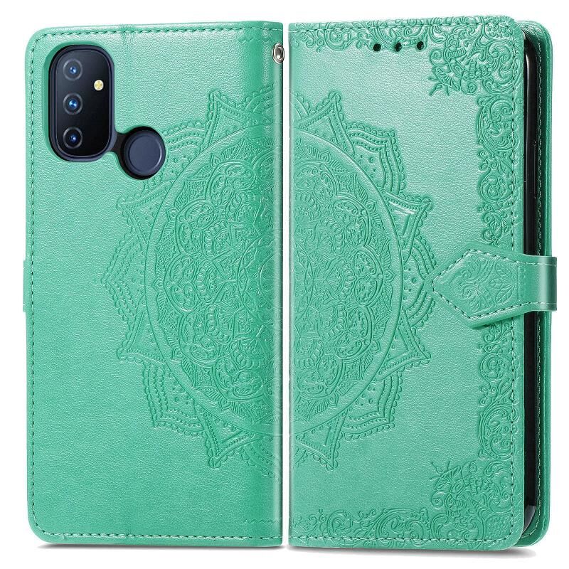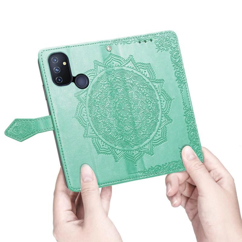 Θήκη OnePlus Nord N100 Mandala Flower ανάγλυφη οριζόντια δερμάτινη με βάση & τρεις θήκες καρτών & πορτοφόλι & κορδόνι (Μαύρο)