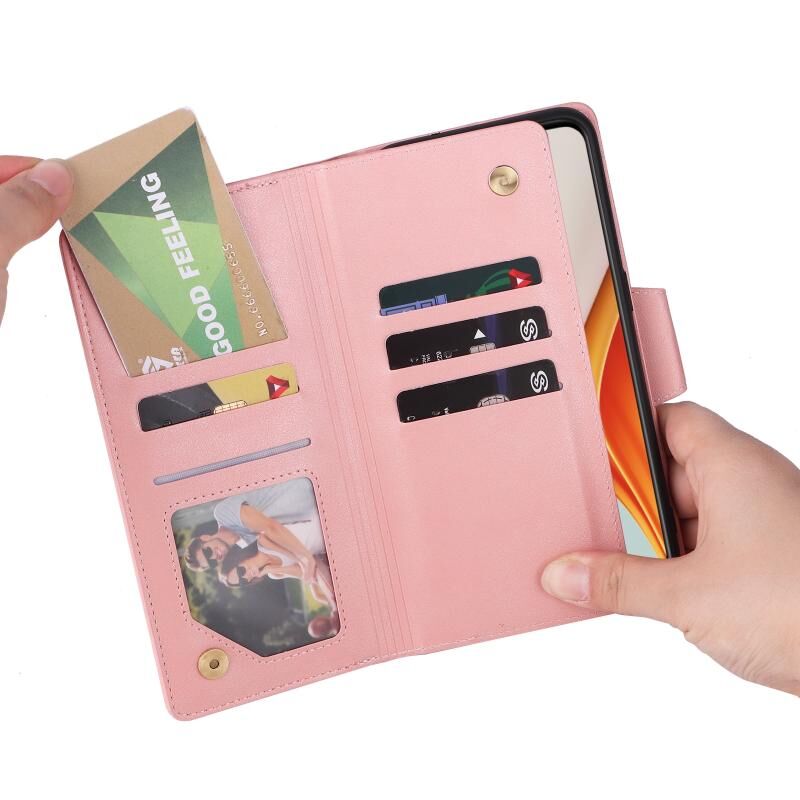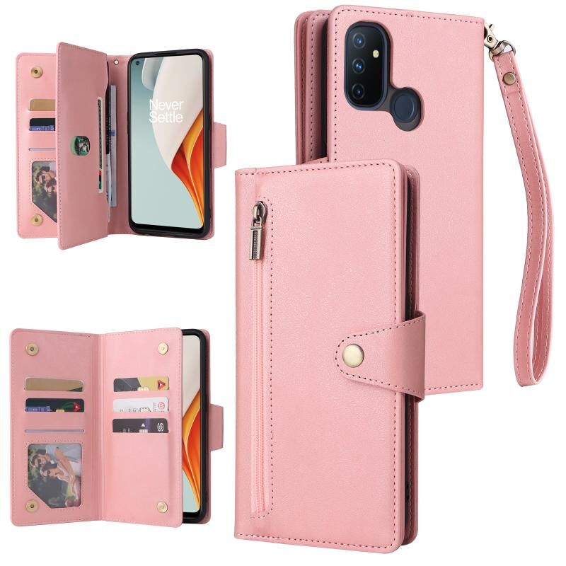 Για OnePlus Nord N100 Rivet πόρπη 9 κάρτες τρεις φορές δερμάτινη θήκη τηλεφώνου (Rose Gold)