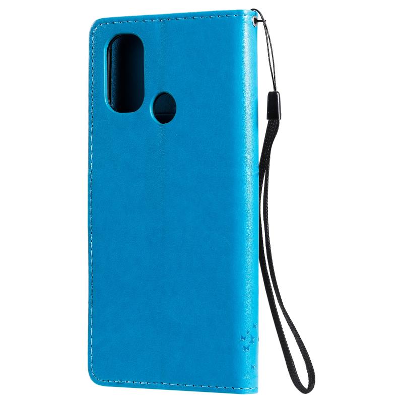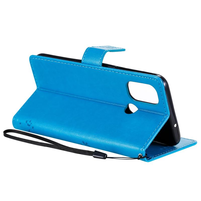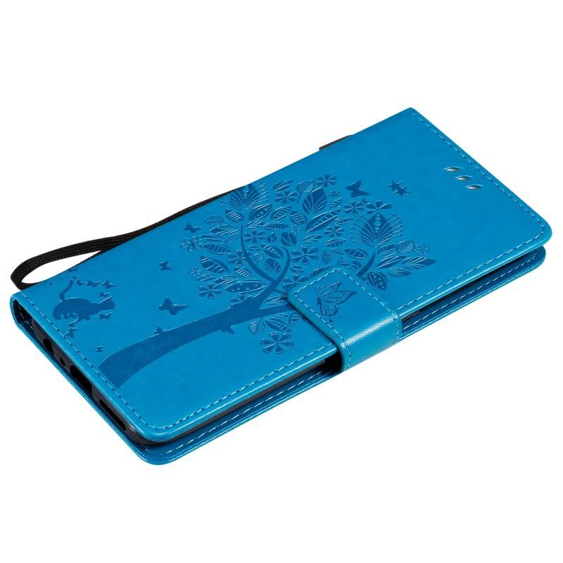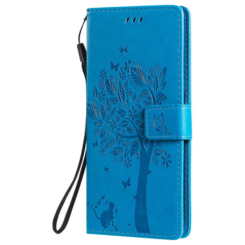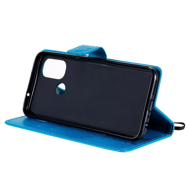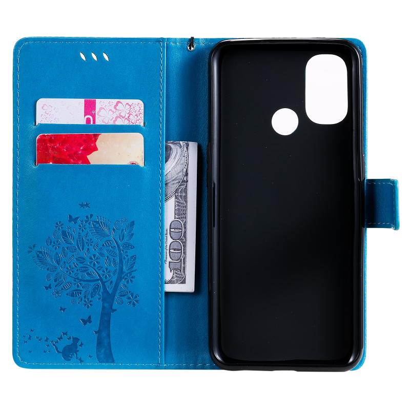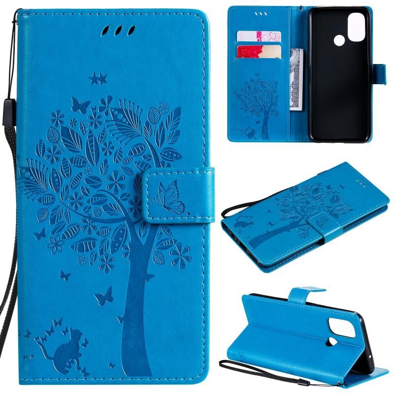 For OnePlus Nord N100 Tree & Cat Pattern Pressed Printing Horizontal Flip PU Leather Case with Holder & Card Slots & Wallet & Lanyard(Blue)