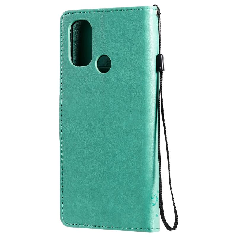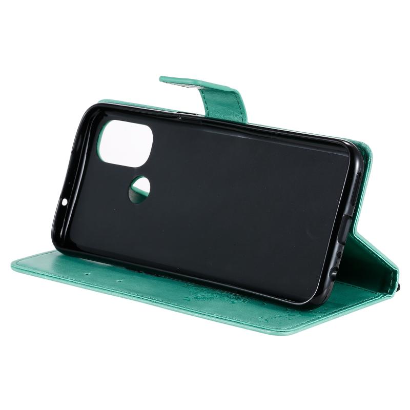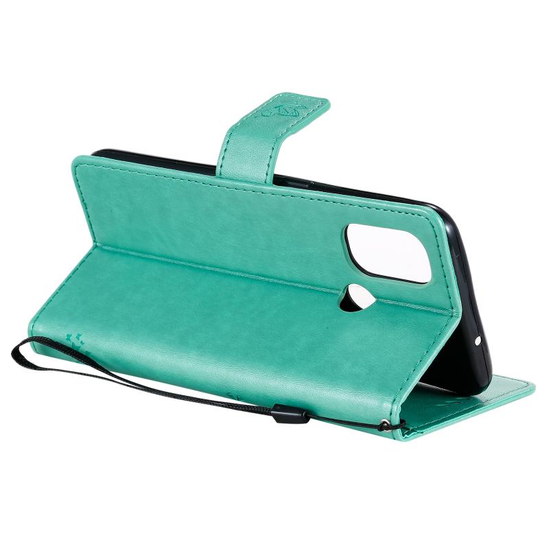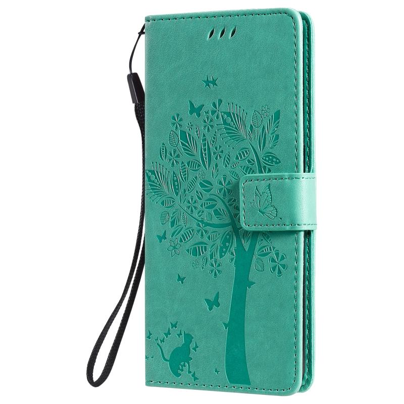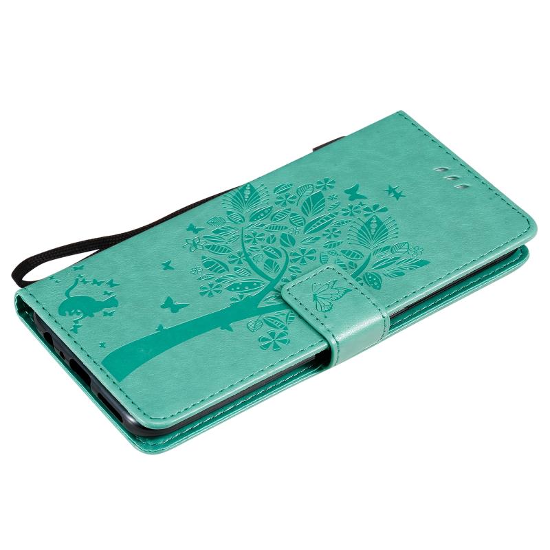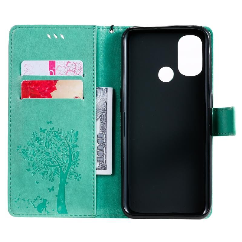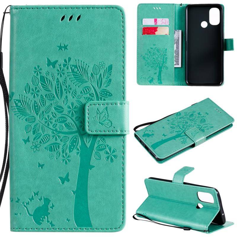 For OnePlus Nord N100 Tree & Cat Pattern Pressed Printing Horizontal Flip PU Leather Case with Holder & Card Slots & Wallet & Lanyard(Green)