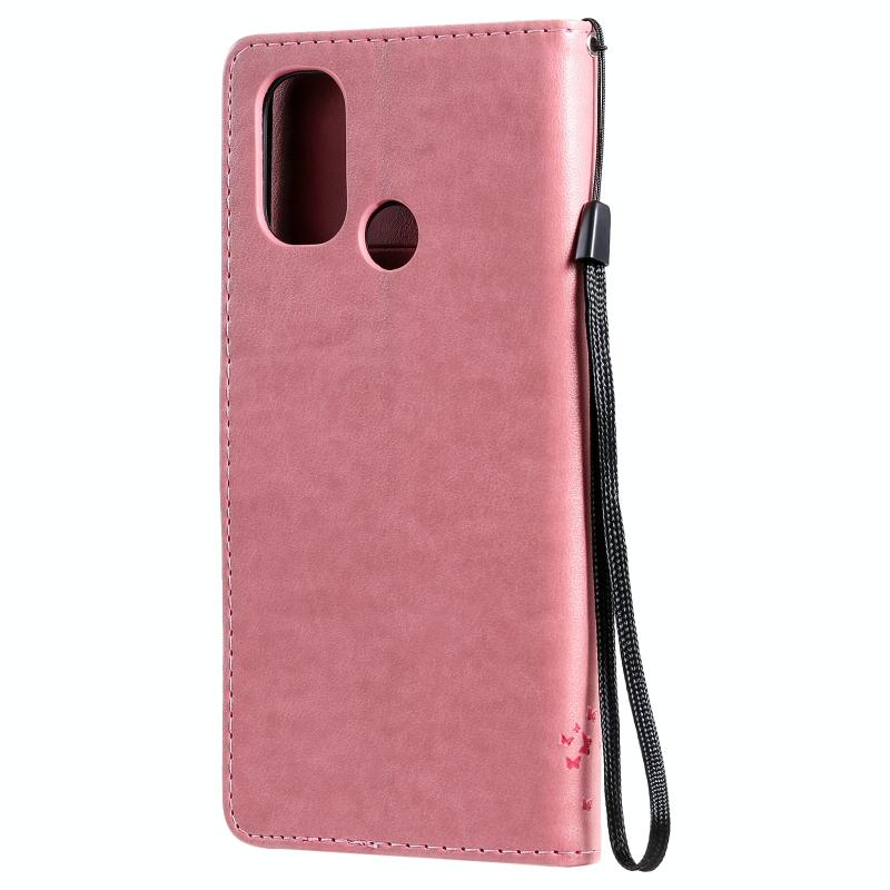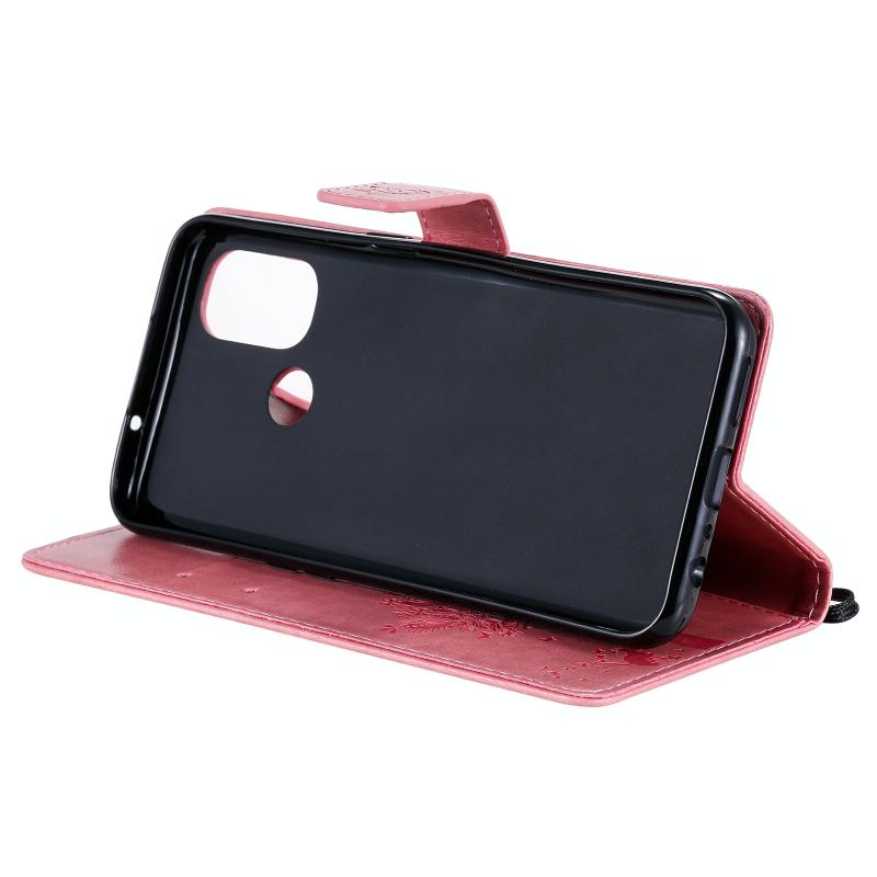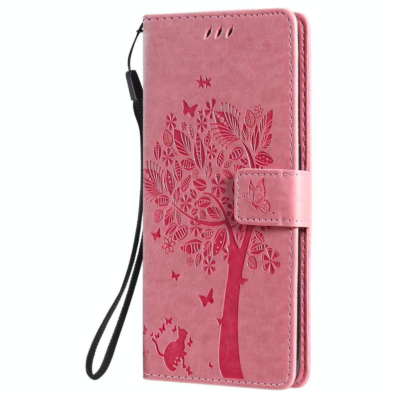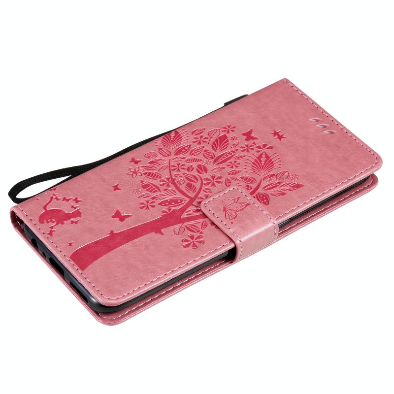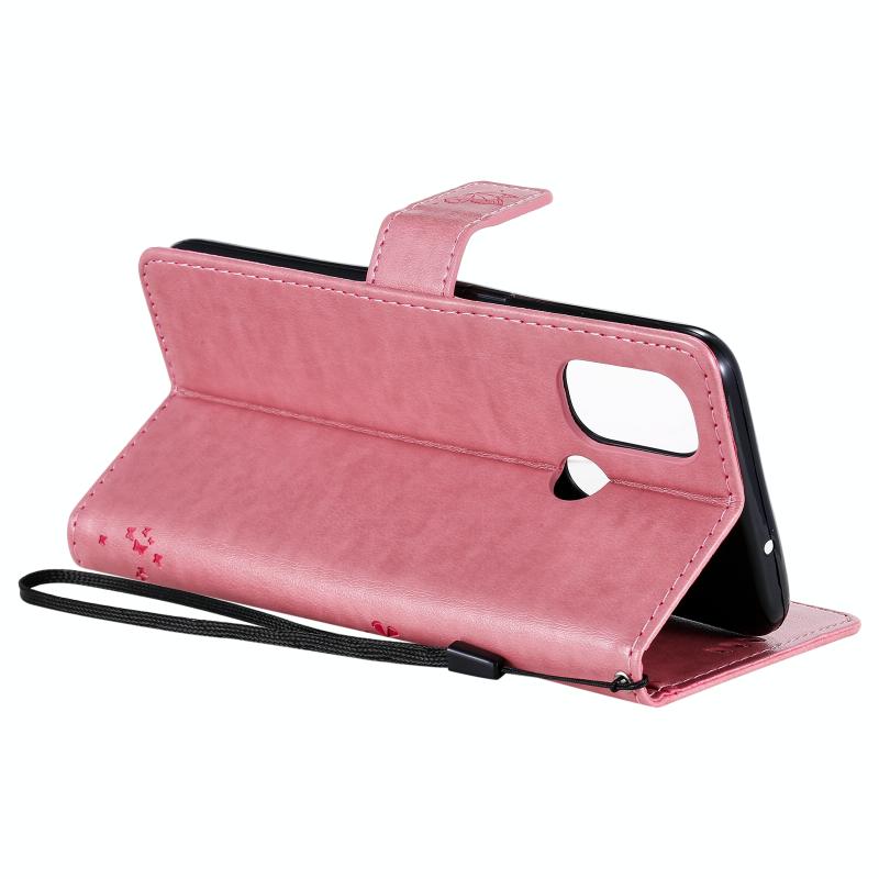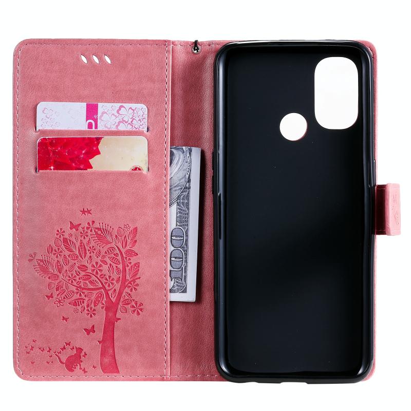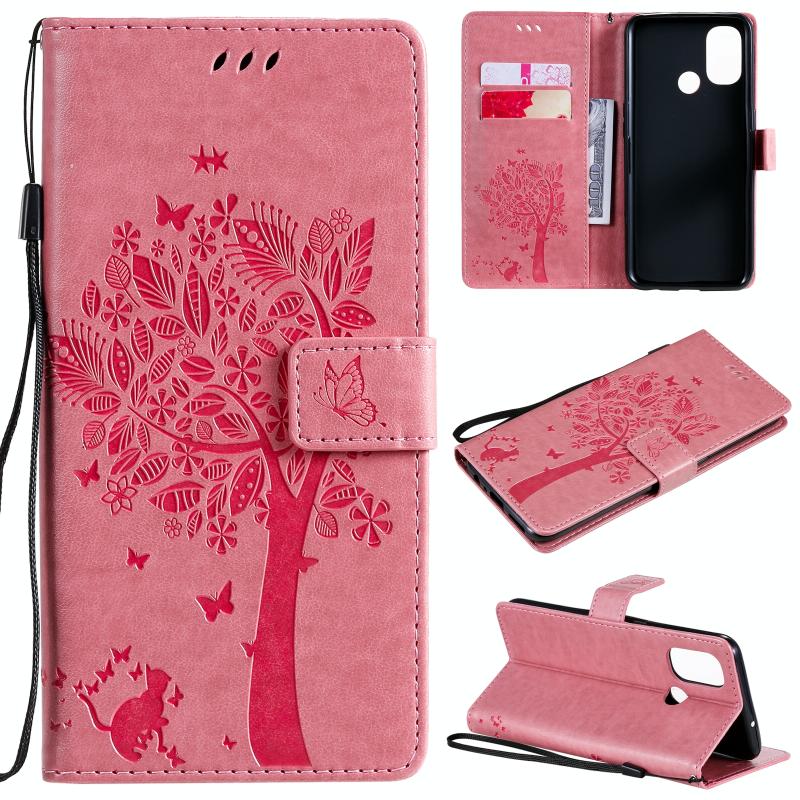 For OnePlus Nord N100 Tree & Cat Pattern Pressed Printing Horizontal Flip PU Leather Case with Holder & Card Slots & Wallet & Lanyard(Pink)