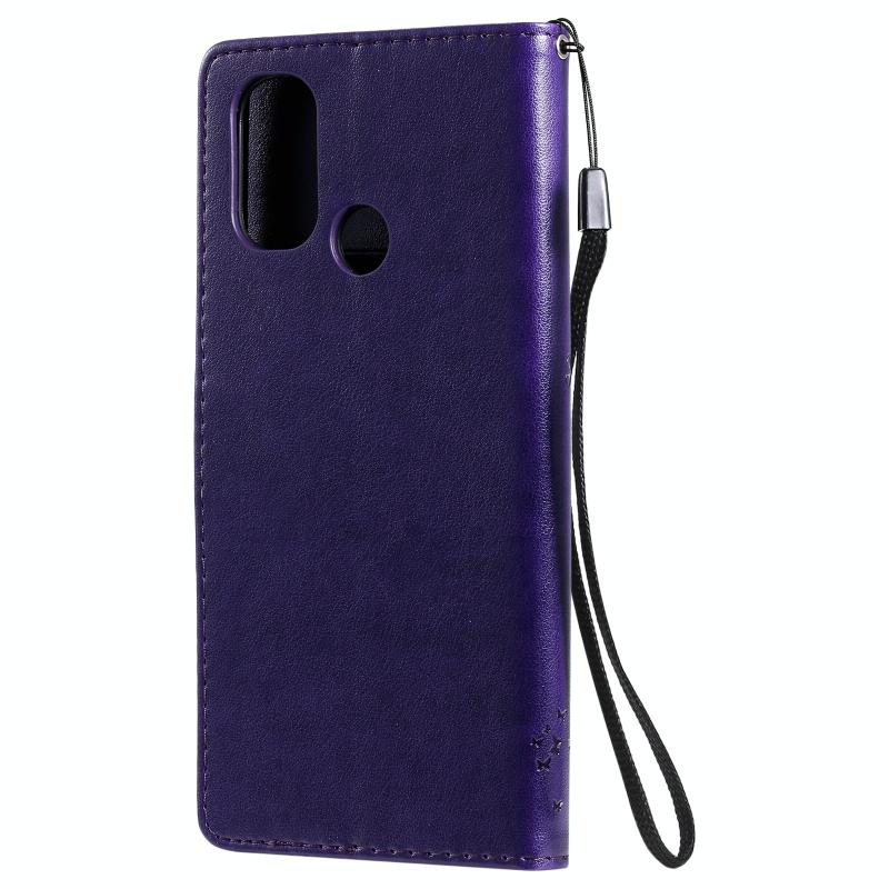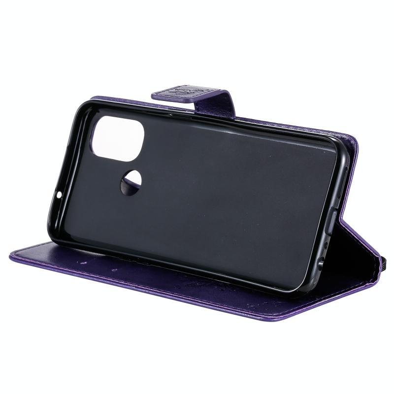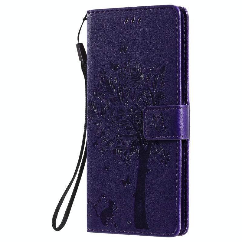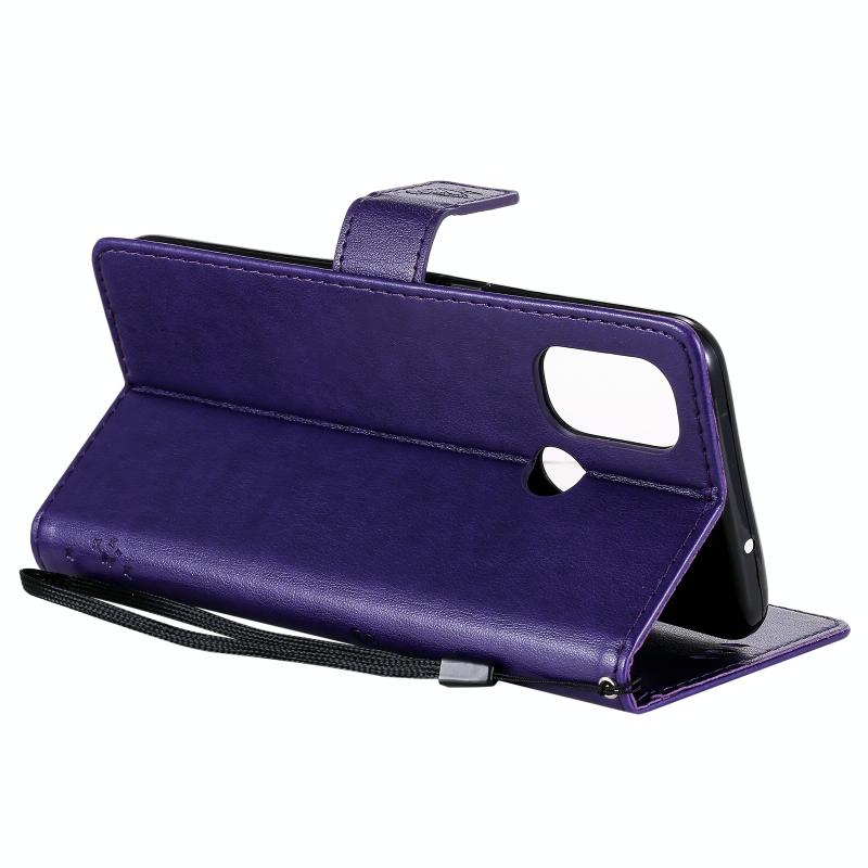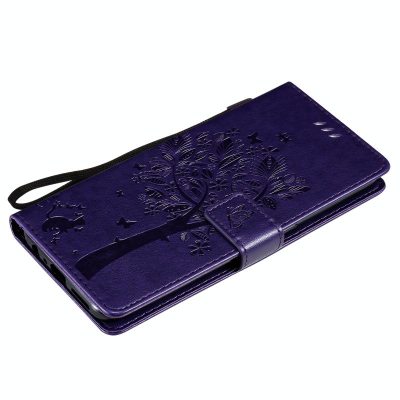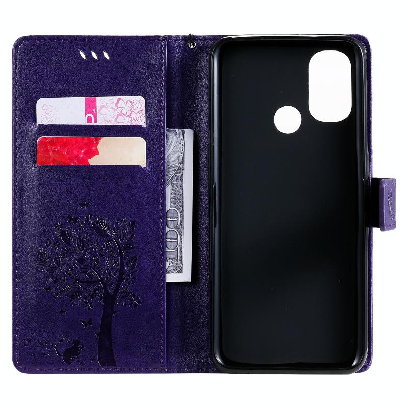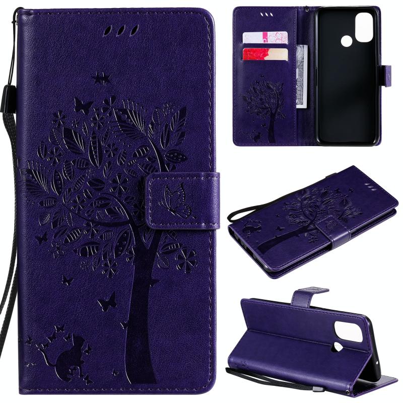 For OnePlus Nord N100 Tree & Cat Pattern Pressed Printing Horizontal Flip PU Leather Case with Holder & Card Slots & Wallet & Lanyard(Purple)