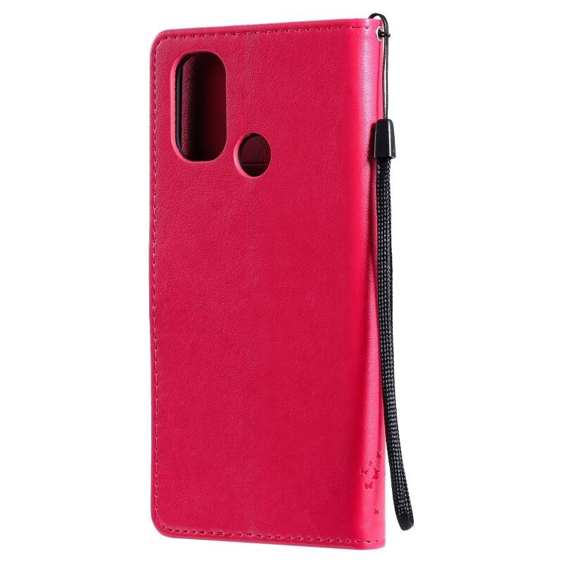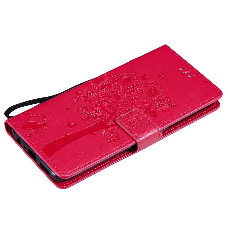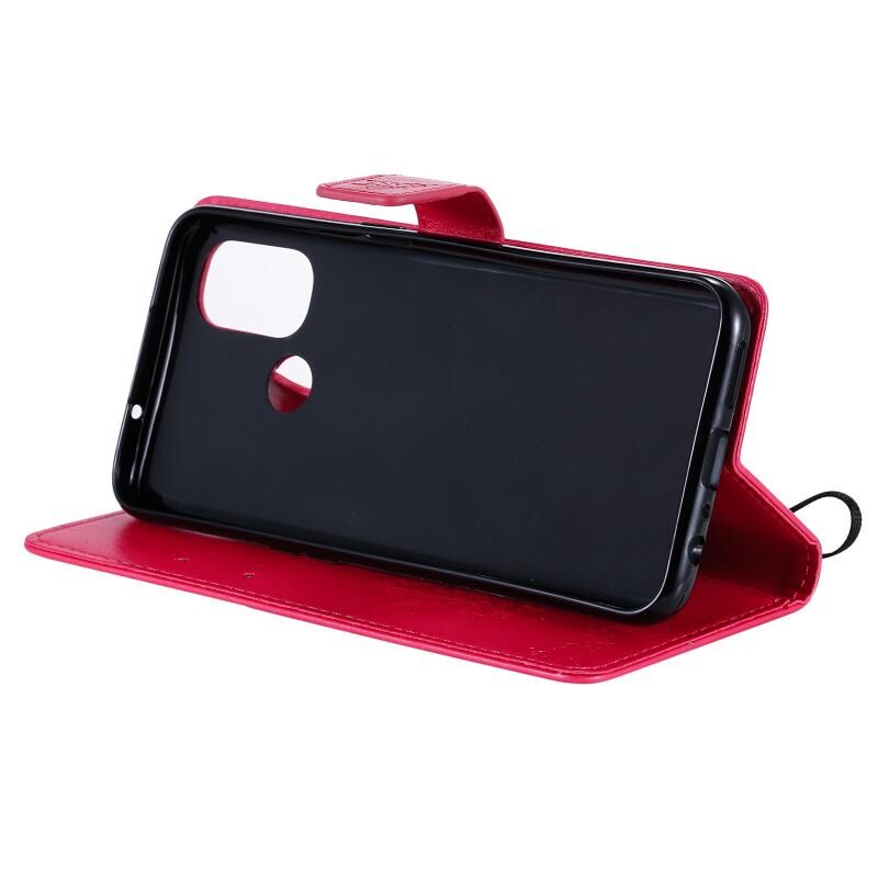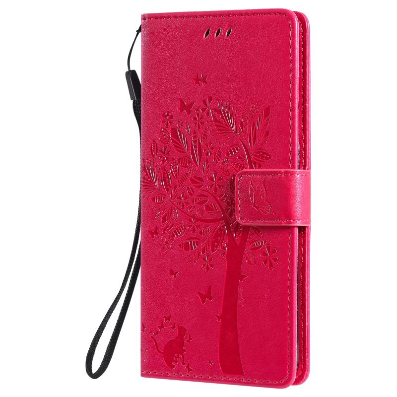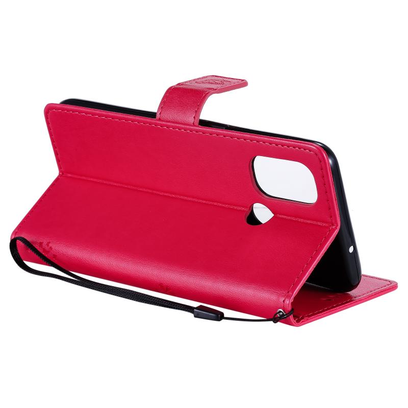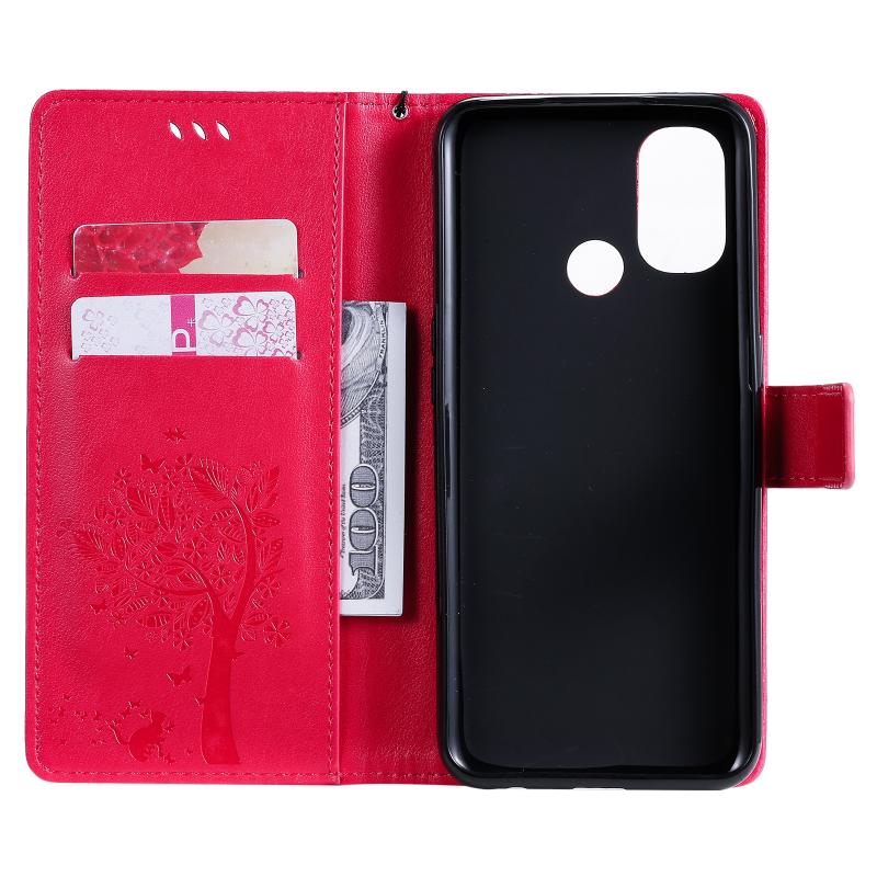For OnePlus Nord N100 Tree & Cat Pattern Pressed Printing Horizontal Flip PU Leather Case with Holder & Card Slots & Wallet & Lanyard(Red)