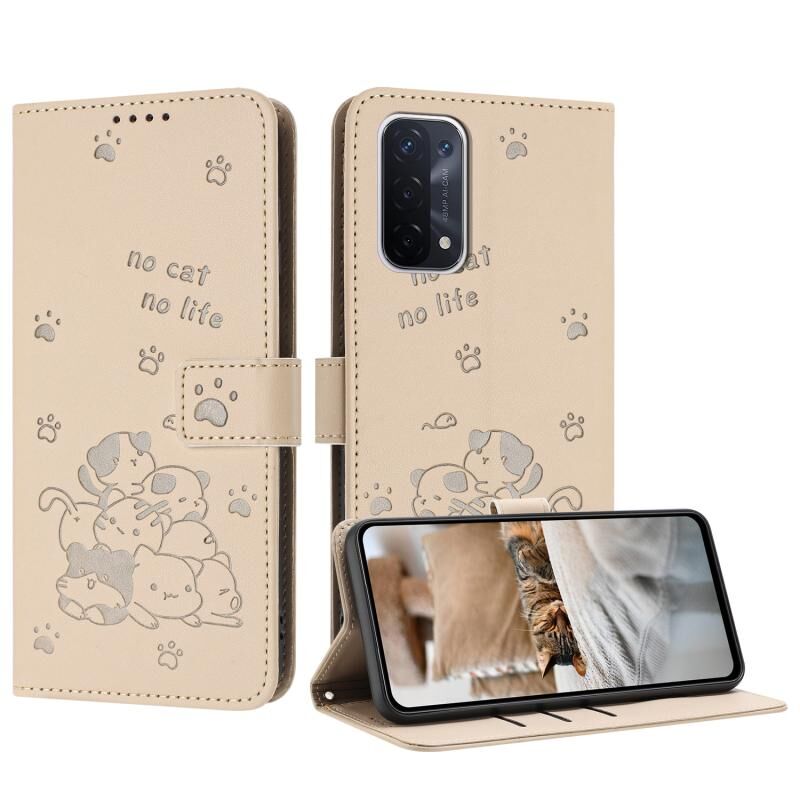 Θήκη δερμάτινη για OnePlus Nord N200 5G με ανάγλυφο γατάκι και κορδόνι (Μπεζ)
