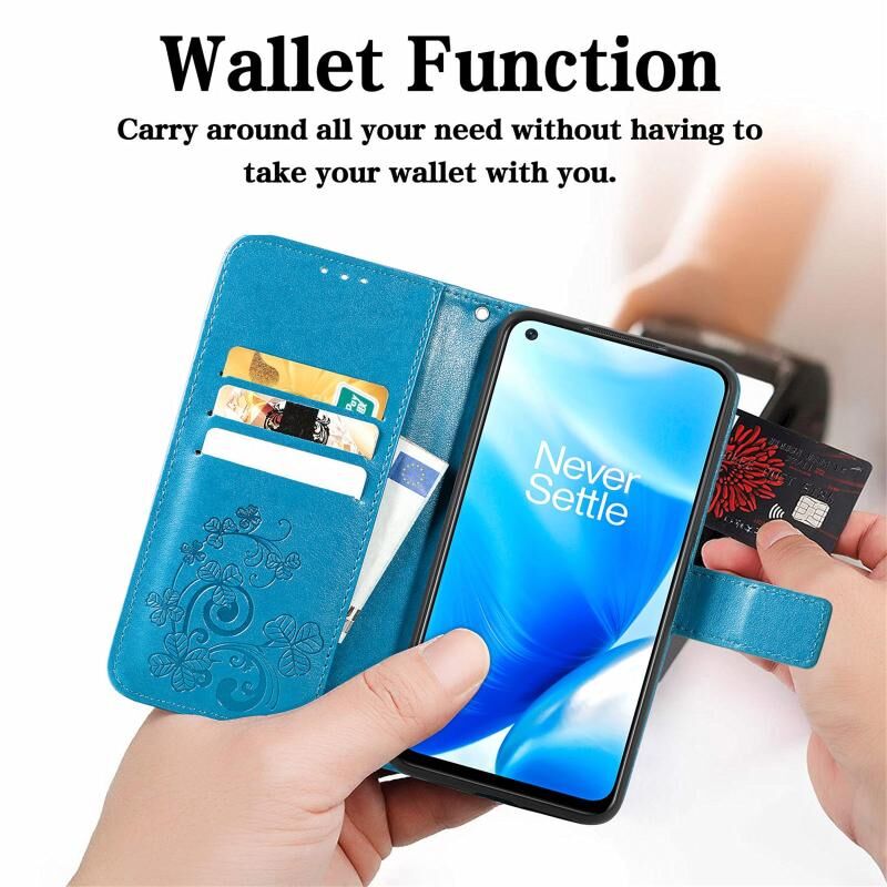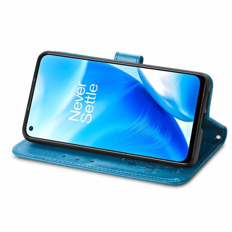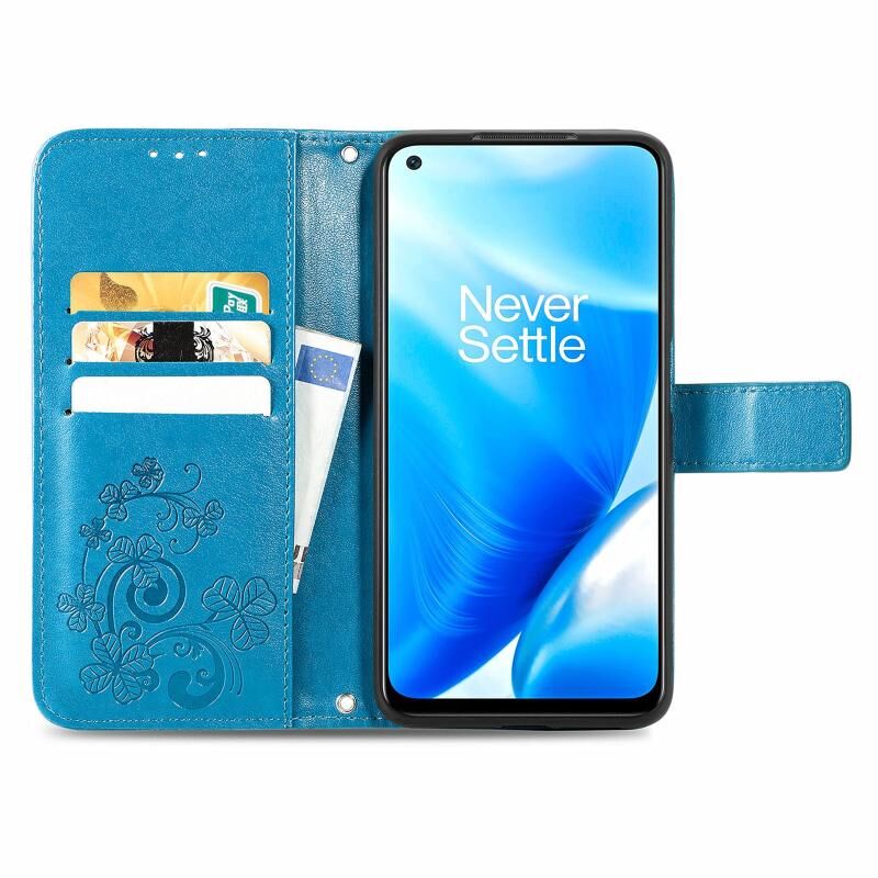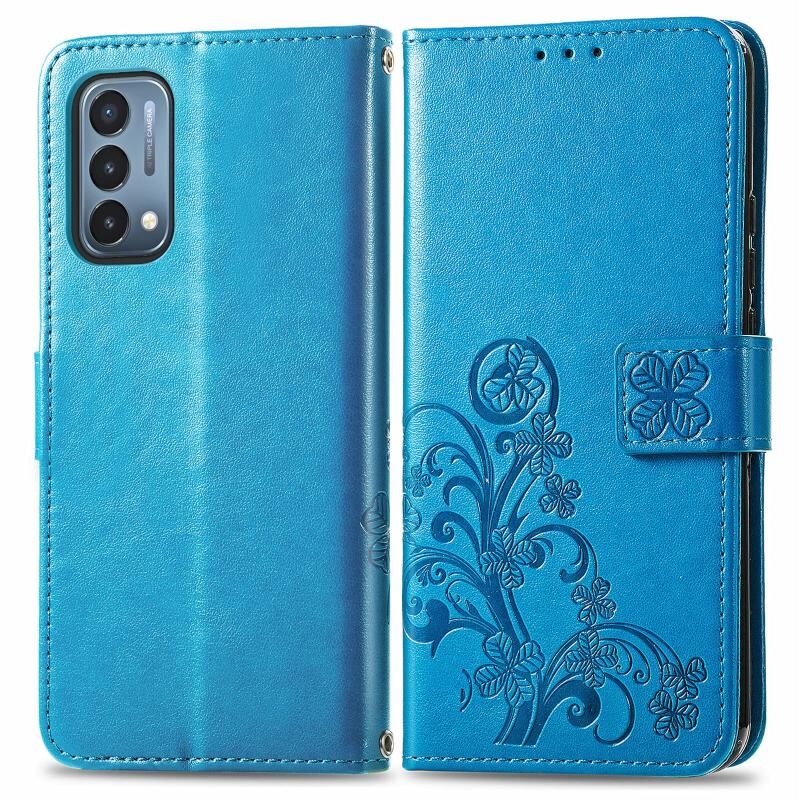 Για OnePlus Nord N200 5G Τέσσερα φύλλα κούμπωμα ανάγλυφο αγκράφα κινητό τηλέφωνο προστασία δερμάτινη θήκη με κορδόνι & υποδοχή κάρτας & πορτοφόλι & λειτουργία βραχίονα (μπλε)