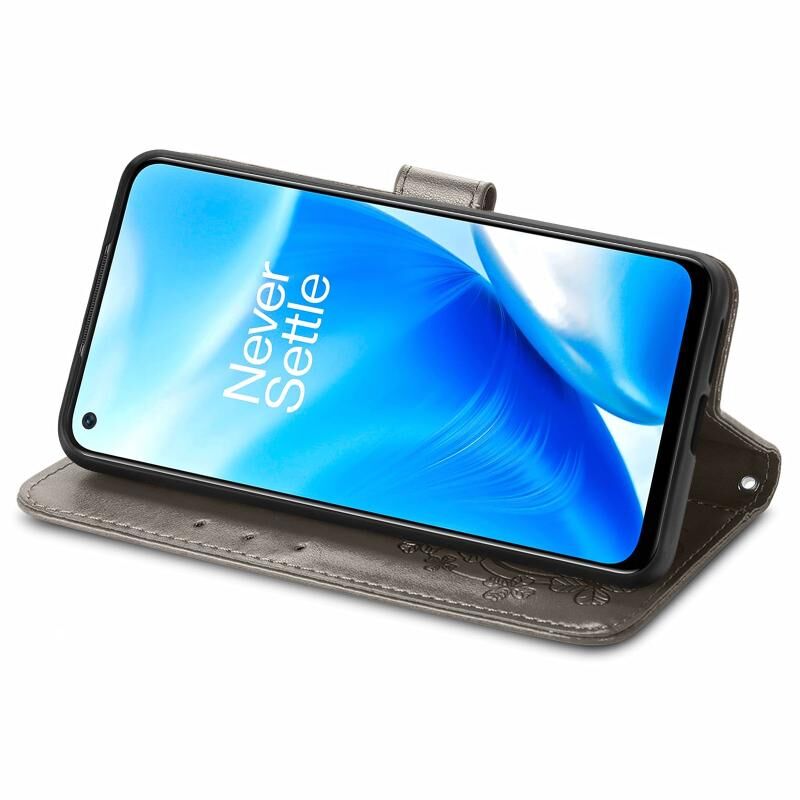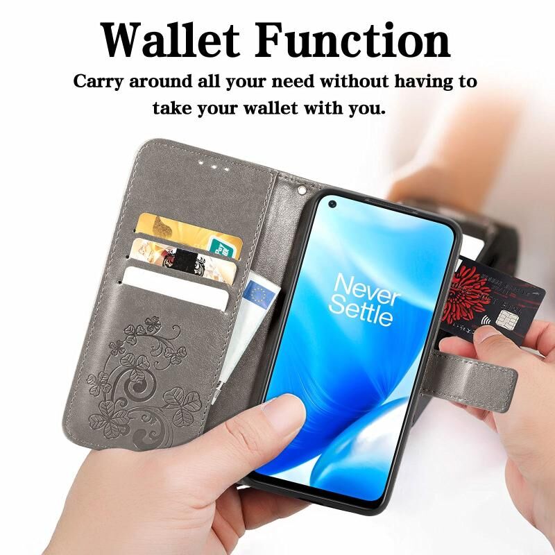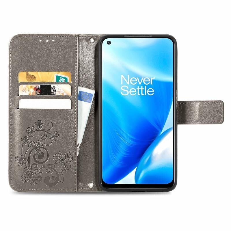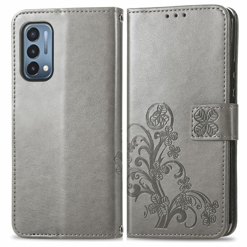 Για OnePlus Nord N200 5G Τέσσερα φύλλα κούμπωμα ανάγλυφο αγκράφα κινητό τηλέφωνο προστασία δερμάτινη θήκη με κορδόνι & υποδοχή κάρτας & πορτοφόλι & λειτουργία βραχίονα (γκρι)