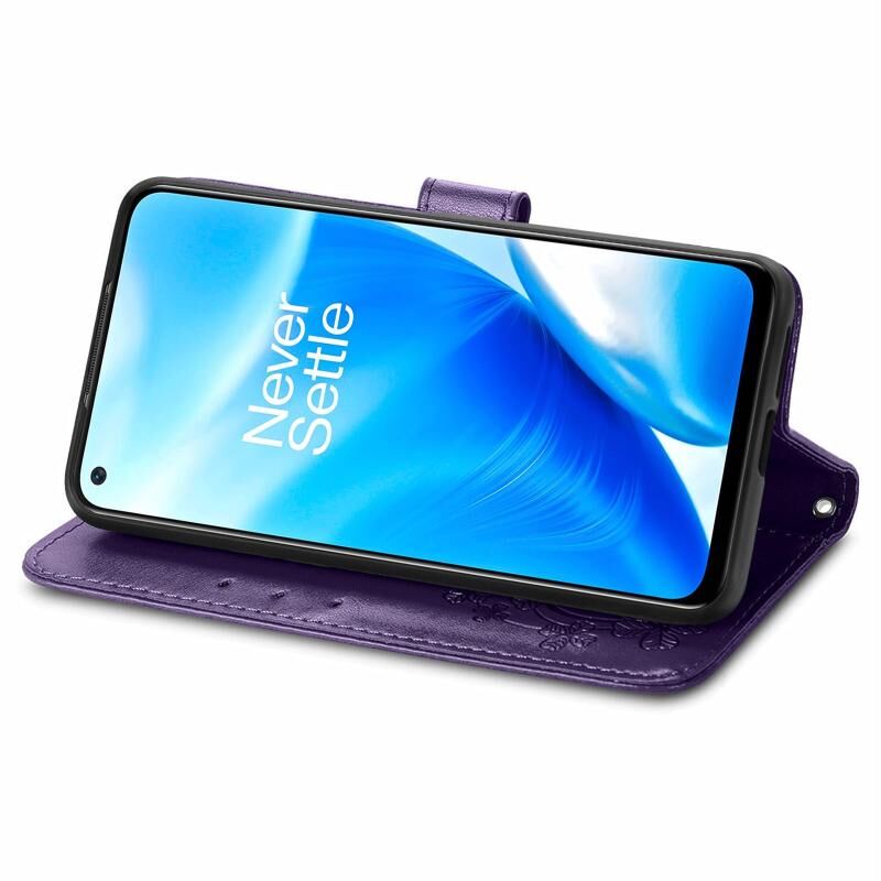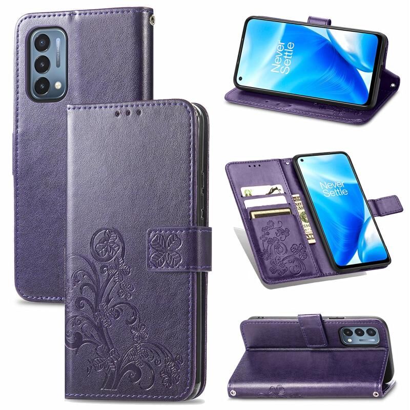 Για OnePlus Nord N200 5G Τέσσερα φύλλα κούμπωμα ανάγλυφο αγκράφα κινητό τηλέφωνο προστασία δερμάτινη θήκη με κορδόνι & υποδοχή κάρτας & πορτοφόλι & λειτουργία βραχίονα (μωβ)