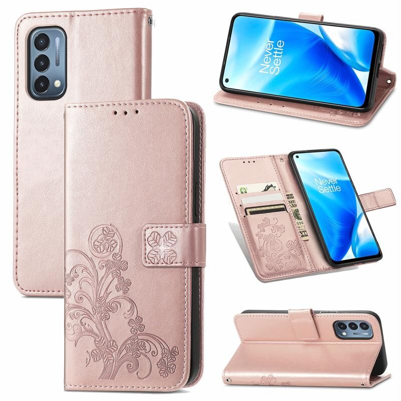 Για OnePlus Nord N200 5G Τέσσερα φύλλα κούμπωμα ανάγλυφο αγκράφα κινητό τηλέφωνο προστασία δερμάτινη θήκη με κορδόνι & υποδοχή κάρτας & πορτοφόλι & λειτουργία βραχίονα (Rose Gold)