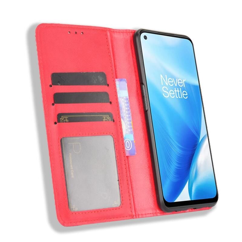 Για OnePlus Nord N200 5G Μαγνητική πόρπη Retro Crazy Horse Υφή οριζόντια Flip δερμάτινη θήκη με υποδοχή & υποδοχές καρτών & πλαίσιο φωτογραφιών (κόκκινο)
