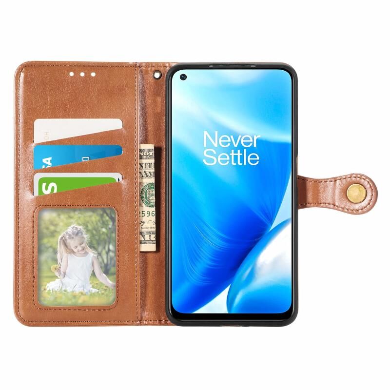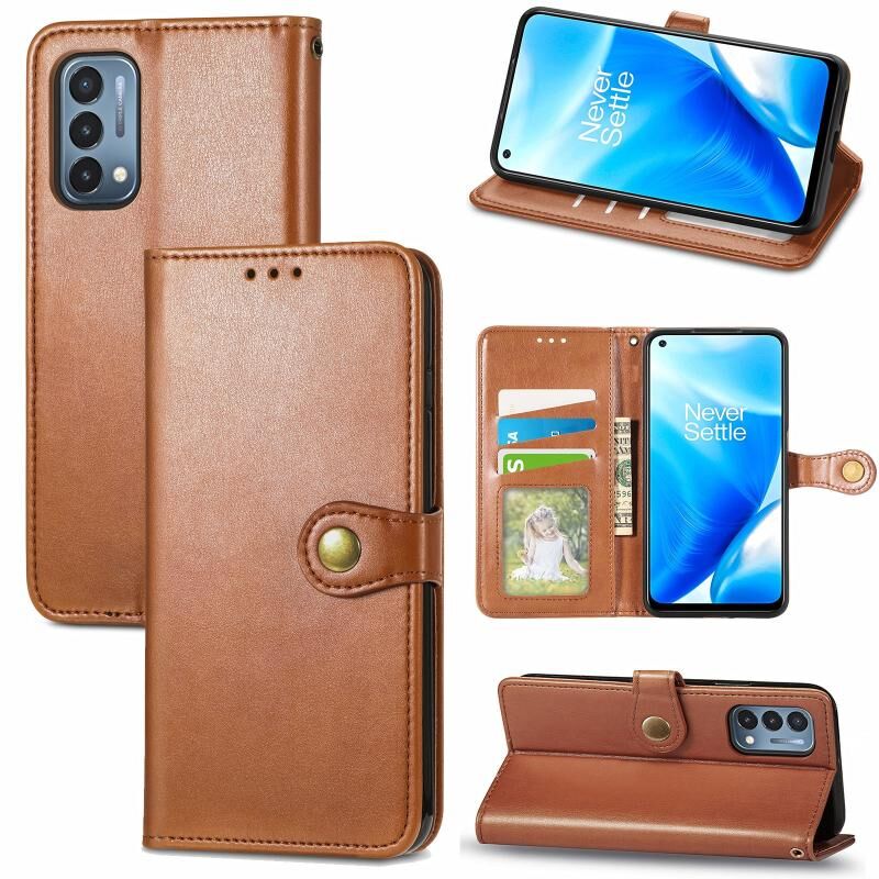 Για OnePlus Nord N200 5G Αμιγές χρώμα δερμάτινη θήκη τηλεφώνου πόρπη με κορδόνι & πλαίσιο φωτογραφιών & υποδοχή κάρτας & πορτοφόλι & λειτουργία Stand (καφέ)