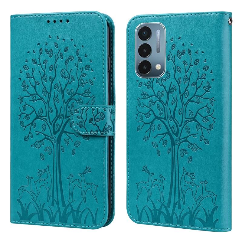 Για OnePlus Nord N200 5G Tree & Deer μοτίβο πιεσμένο εκτύπωση οριζόντια Flip δέρμα τηλέφωνο υπόθεση (μπλε)