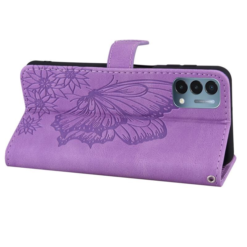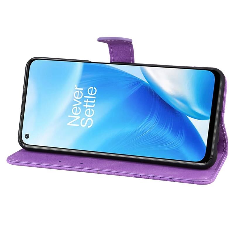 Θήκη δέρματος οριζόντιας αναδίπλωσης για OnePlus Nord N200 με υφή retro, ανάγλυφα σχέδια πεταλούδων, με βάση στήριξης & θήκες καρτών & πορτοφόλι (Καφέ)