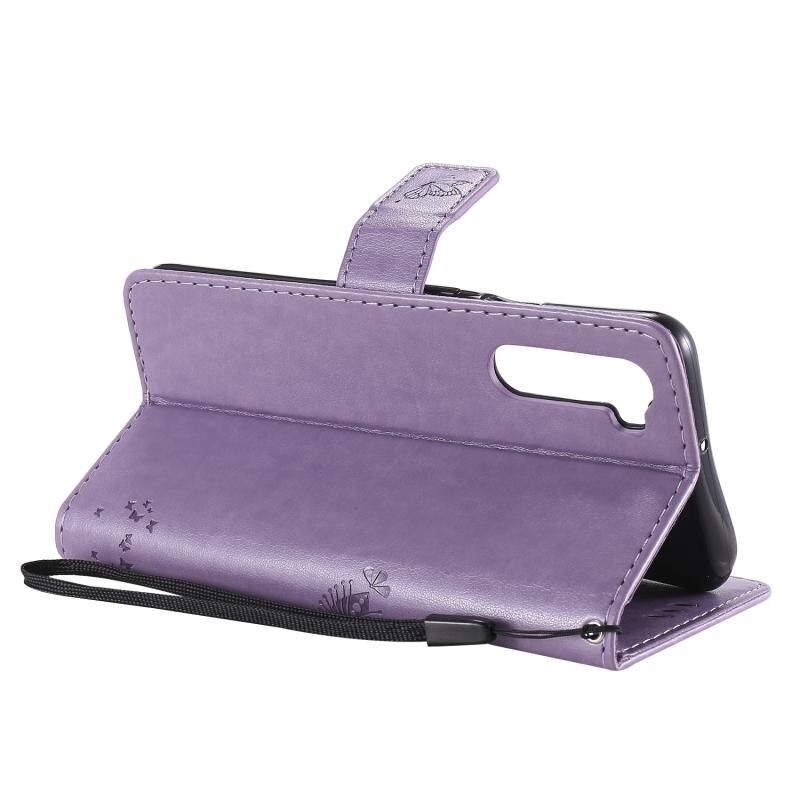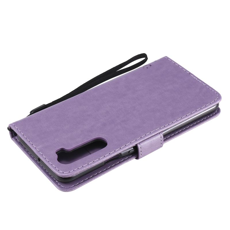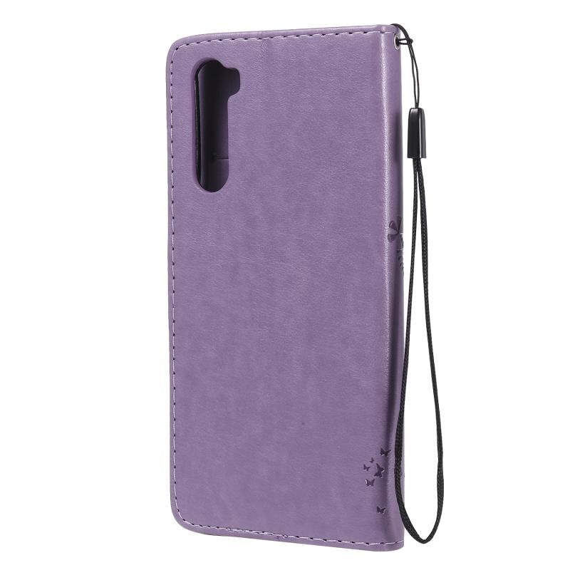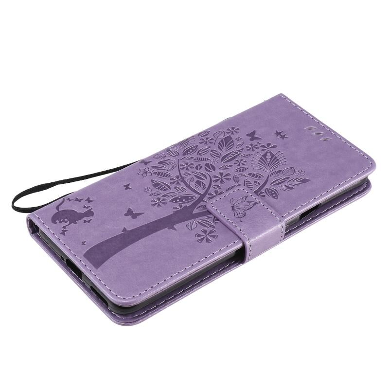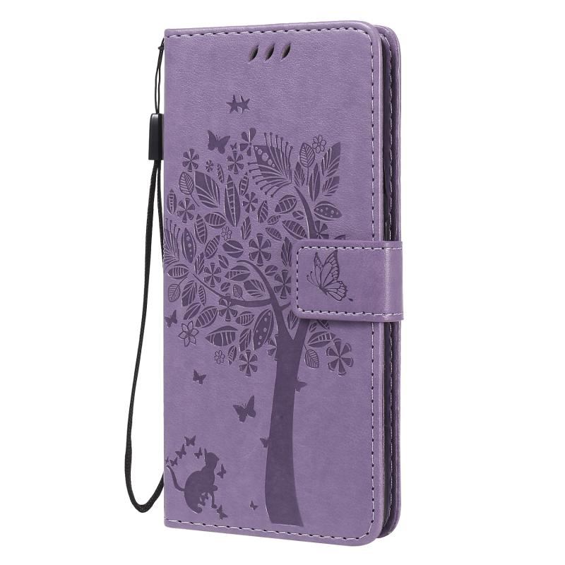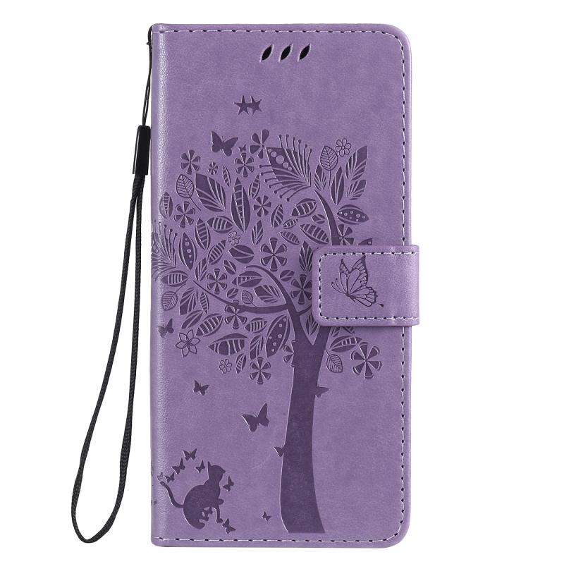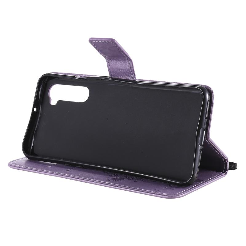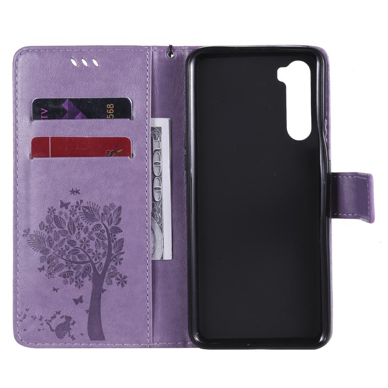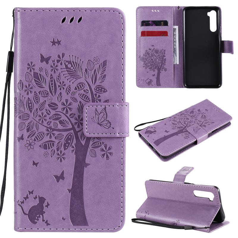 Θήκη για OnePlus Nord με σχέδιο Δέντρου & Γάτας, με ανάγλυφη εκτύπωση, οριζόντια, από δερματίνη PU με βάση στήριξης, θήκες για κάρτες, πορτοφόλι & λουρί (ανοιχτό μωβ)