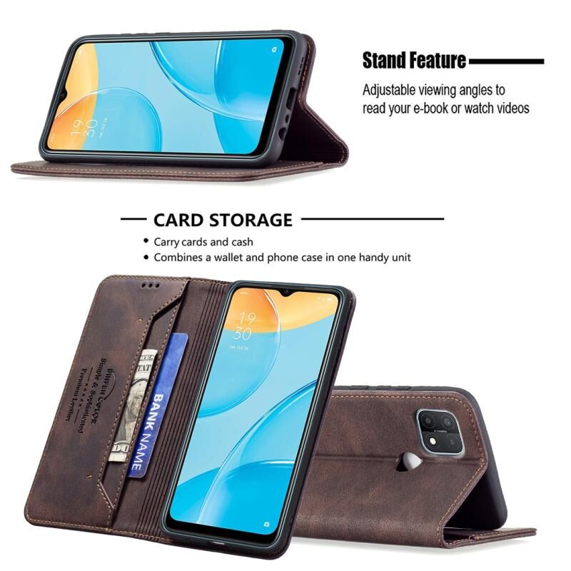 Για OPPO A15 Μαγνητικό RFID Blocking Anti-Theft Δερμάτινη θήκη με κάτοχο & υποδοχές καρτών & πορτοφόλι (καφέ)