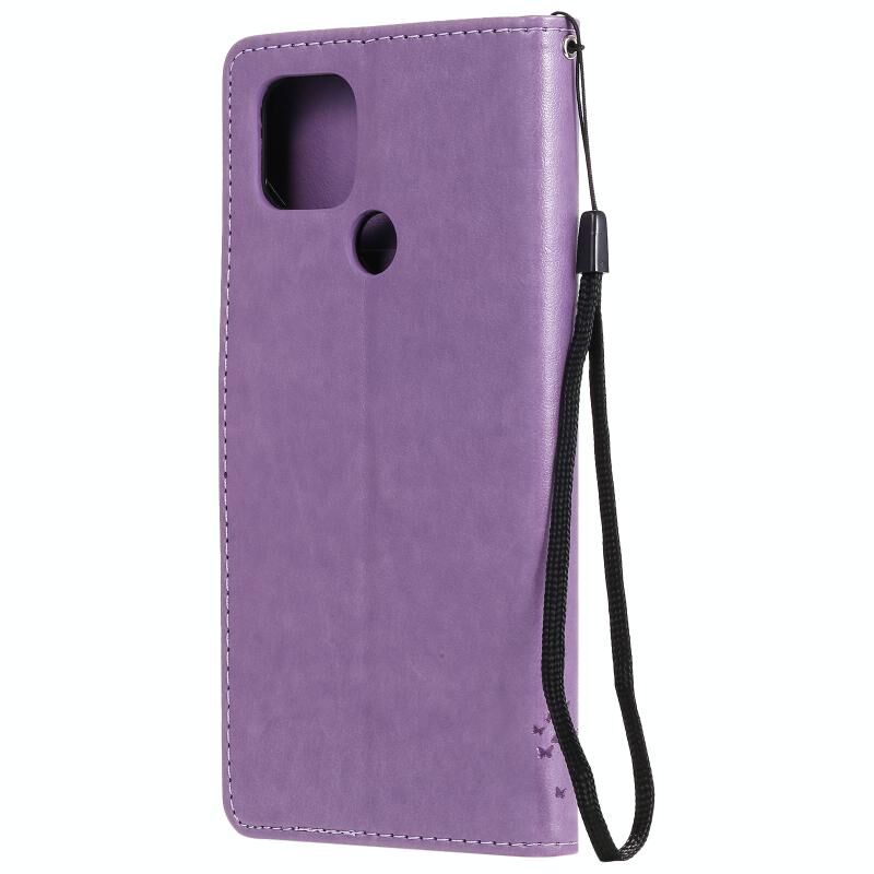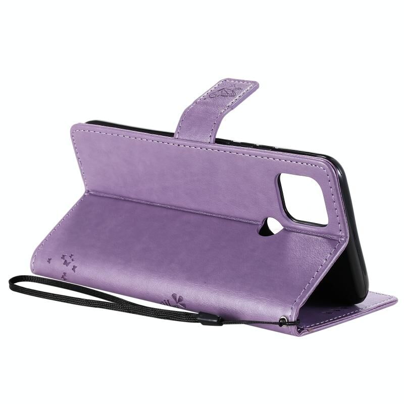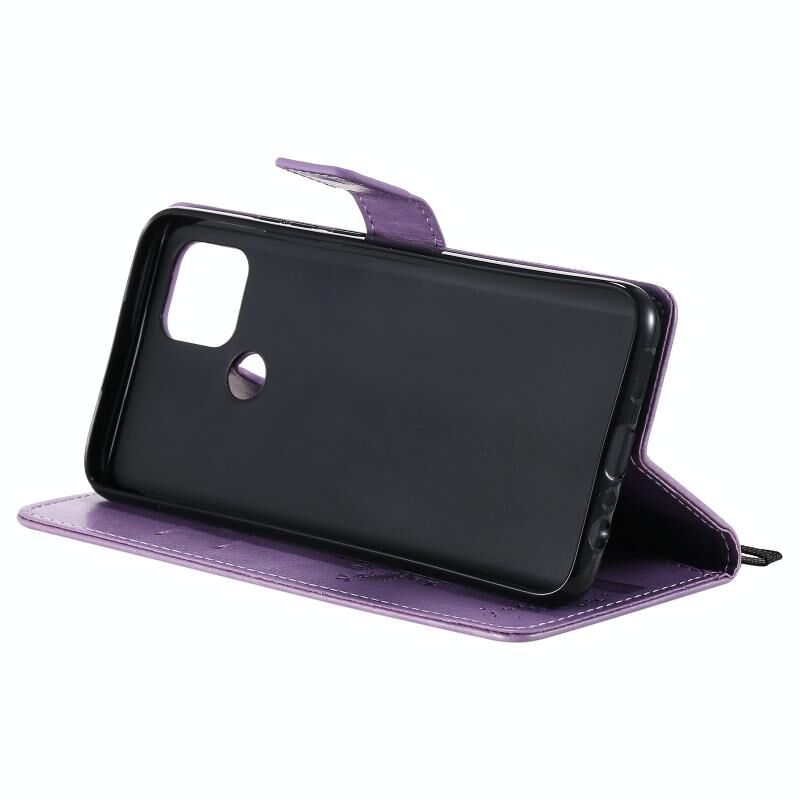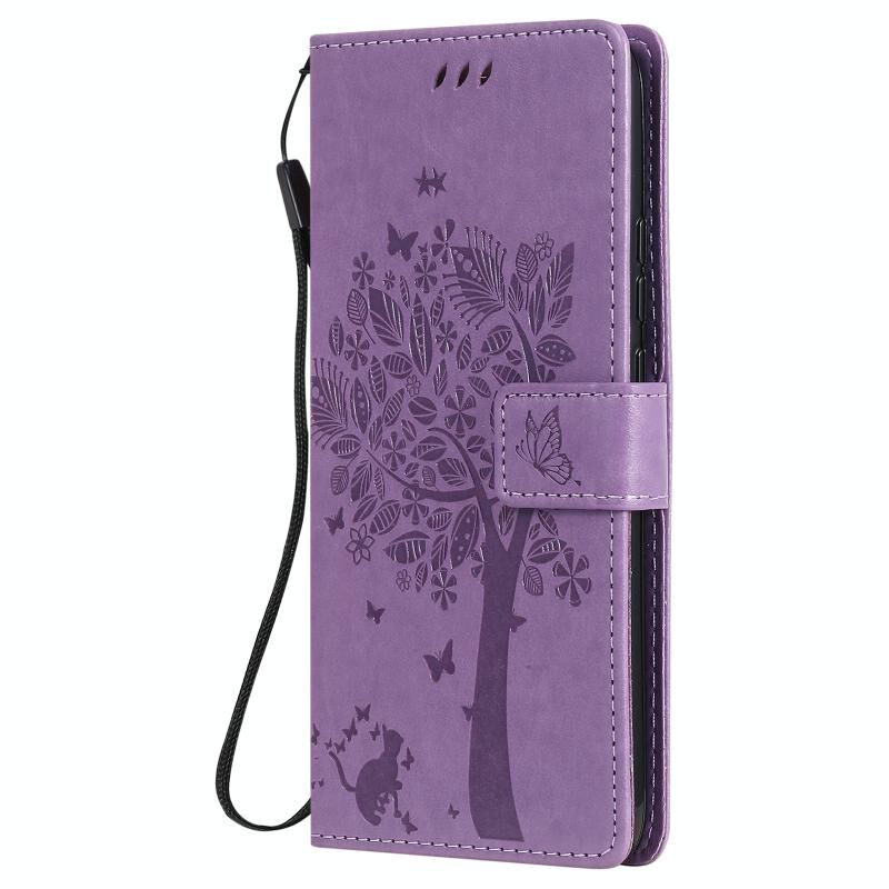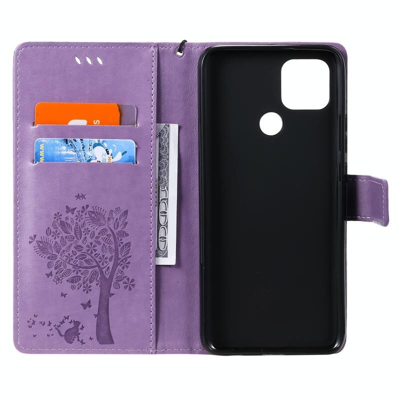 Θήκη για OPPO A15 με σχέδιο Δέντρου & Γάτας, εκτυπωμένη με θερμοτύπηση, οριζόντια αναδιπλούμενη από δερματίνη PU με βάση στήριξης & θήκες καρτών & πορτοφόλι & κορδόνι (ανοιχτό μωβ)