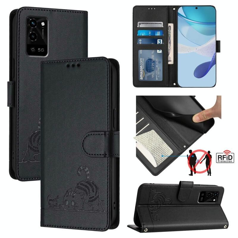 Θήκη τηλεφώνου από δέρμα με ανάγλυφο σχέδιο γάτας και ποντικού για OPPO A16 / A16S / A55S 5G με κορδόνι (Μαύρο)