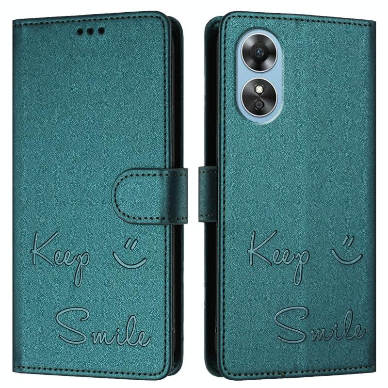 Για OPPO A17 4G Global / A17K Χαμόγελο ανάγλυφο RFID δερμάτινη θήκη τηλεφώνου (Peacock Green)