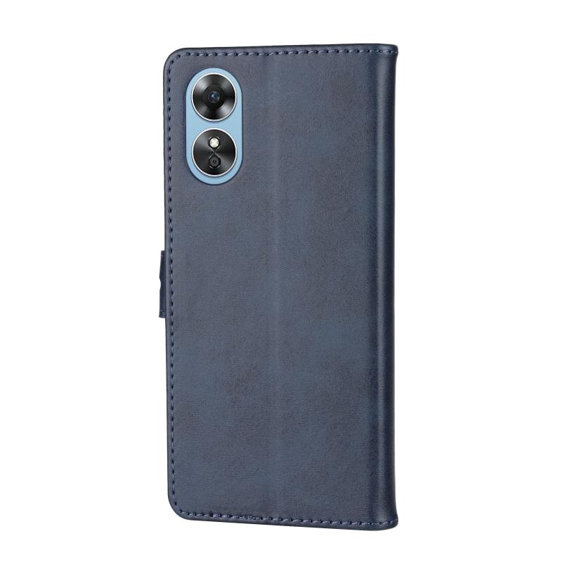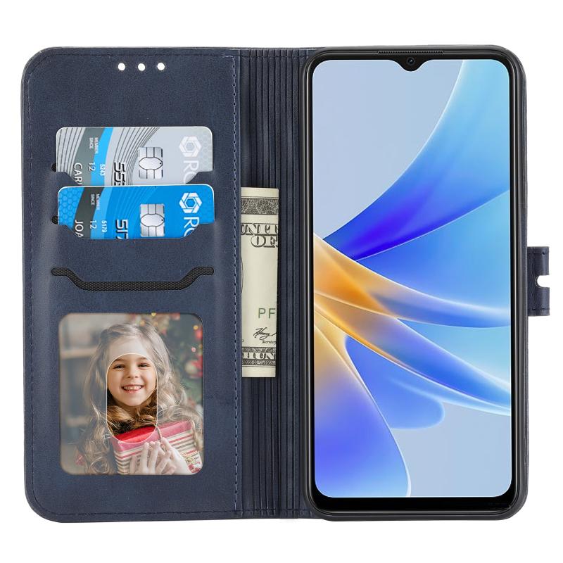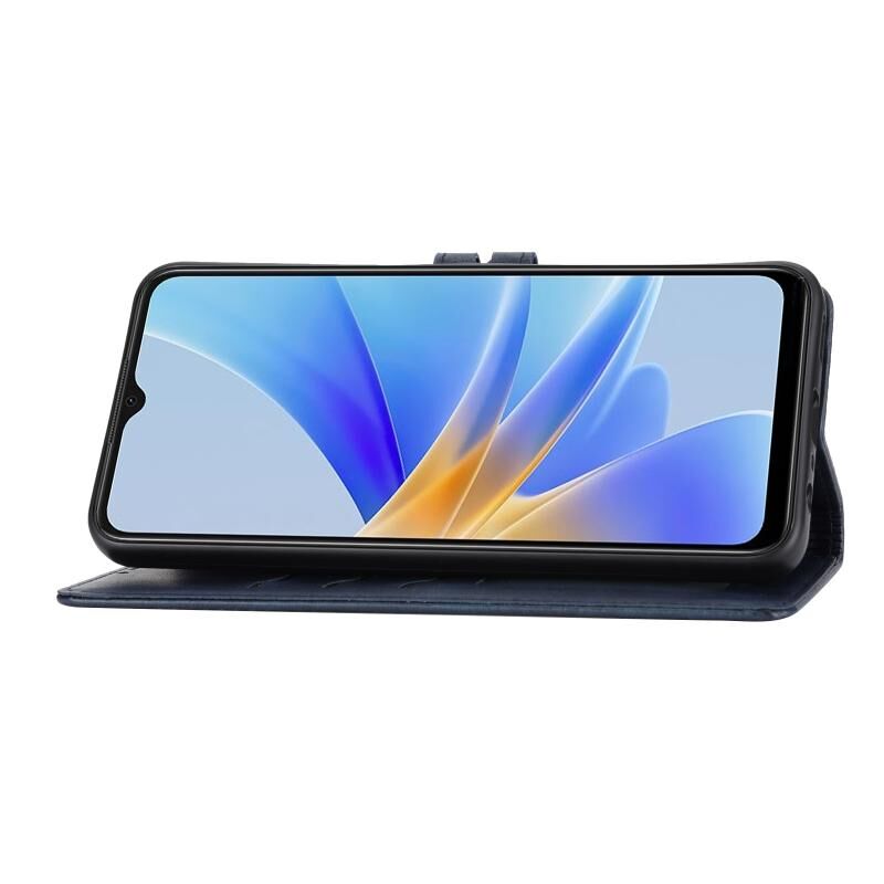 Θήκη τηλεφώνου από δέρμα με σχέδιο χαρούμενης γάτας σε ανάγλυφο για OPPO A17 (Μπλε)